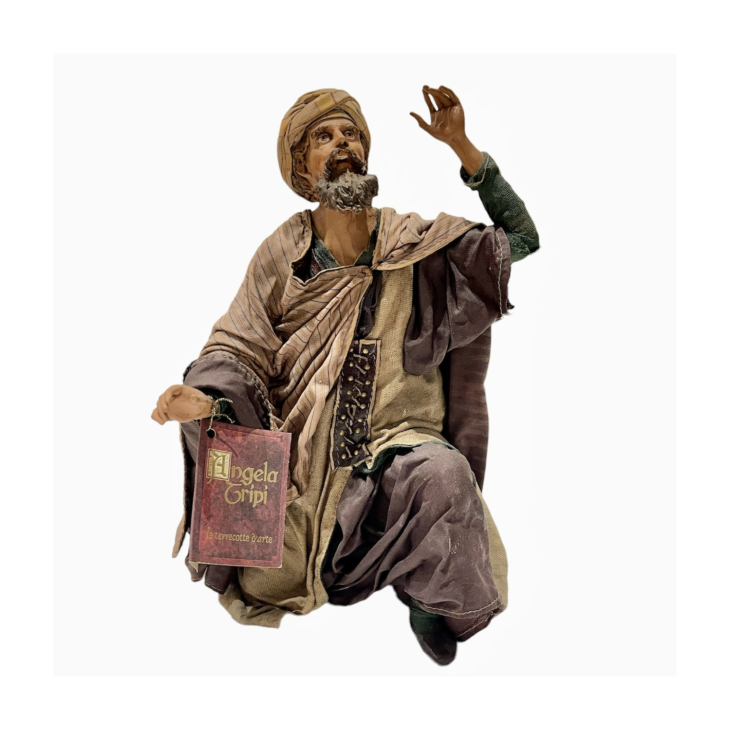 Kneeling shepherd in terracotta dressed in completely handmade fabric clothes.
