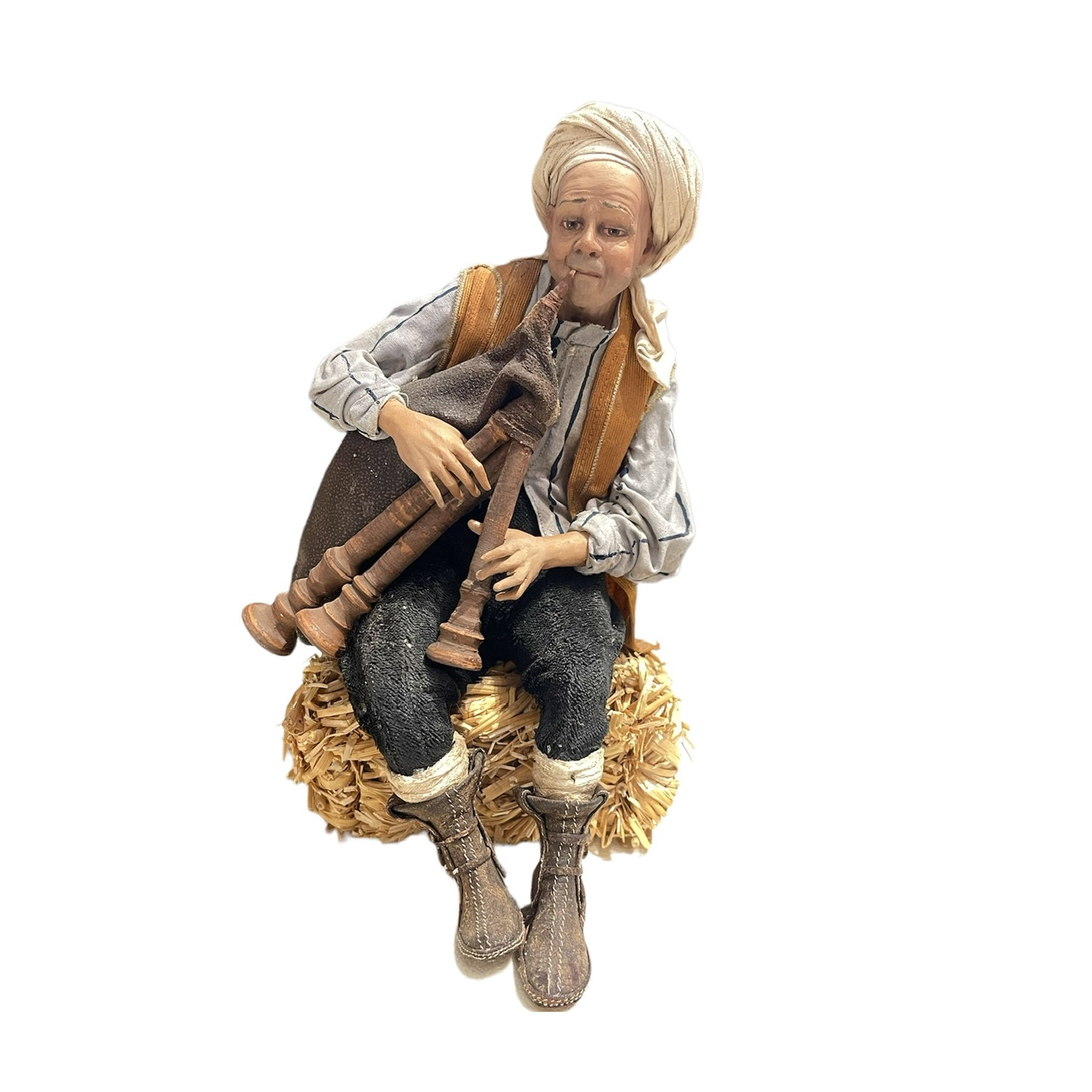 Terracotta bagpiper dressed in completely handmade fabric clothes.