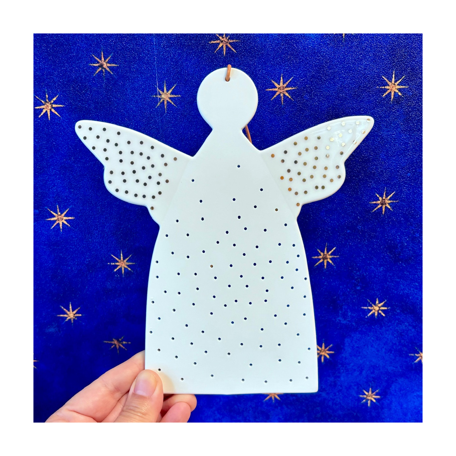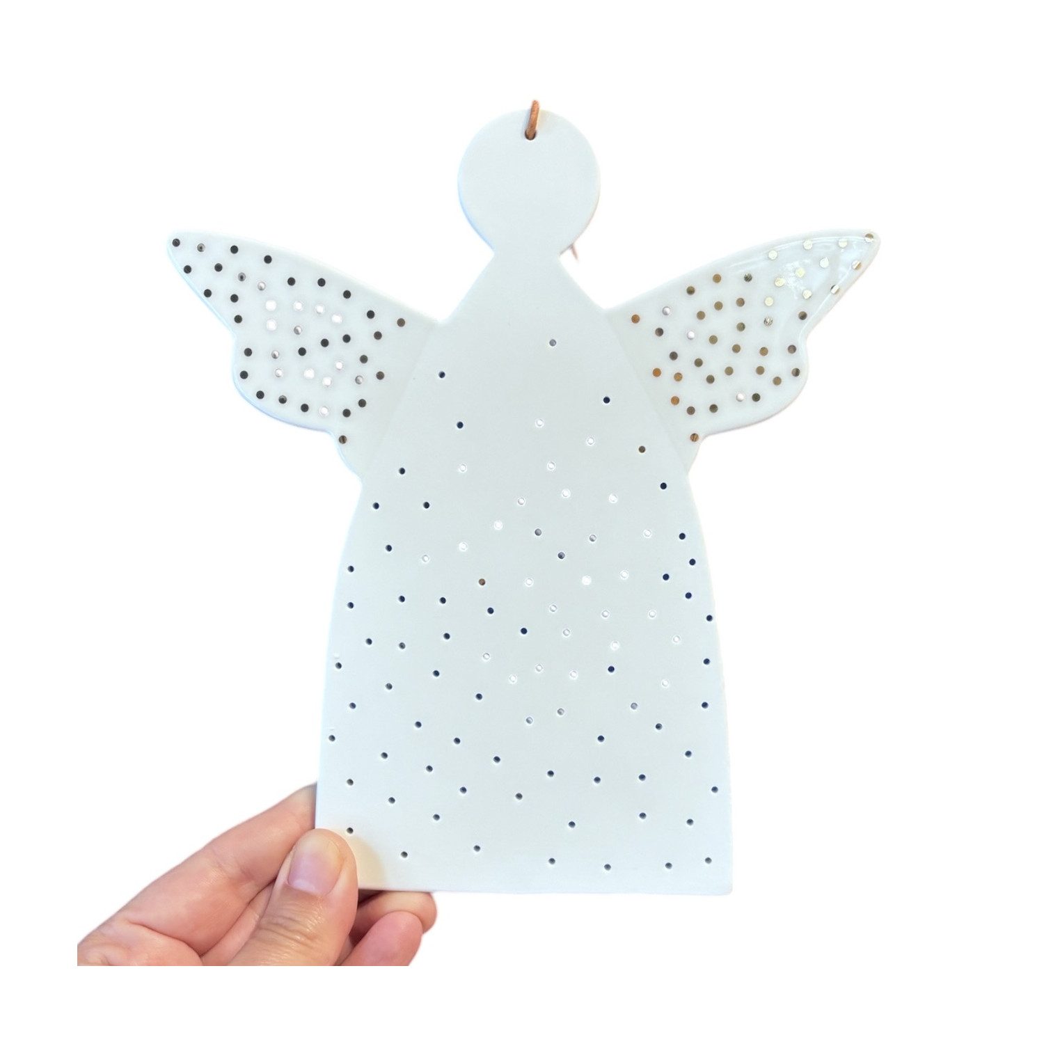 Hanging angel in white porcelain. With perforated and gilded parts. Leather lace.