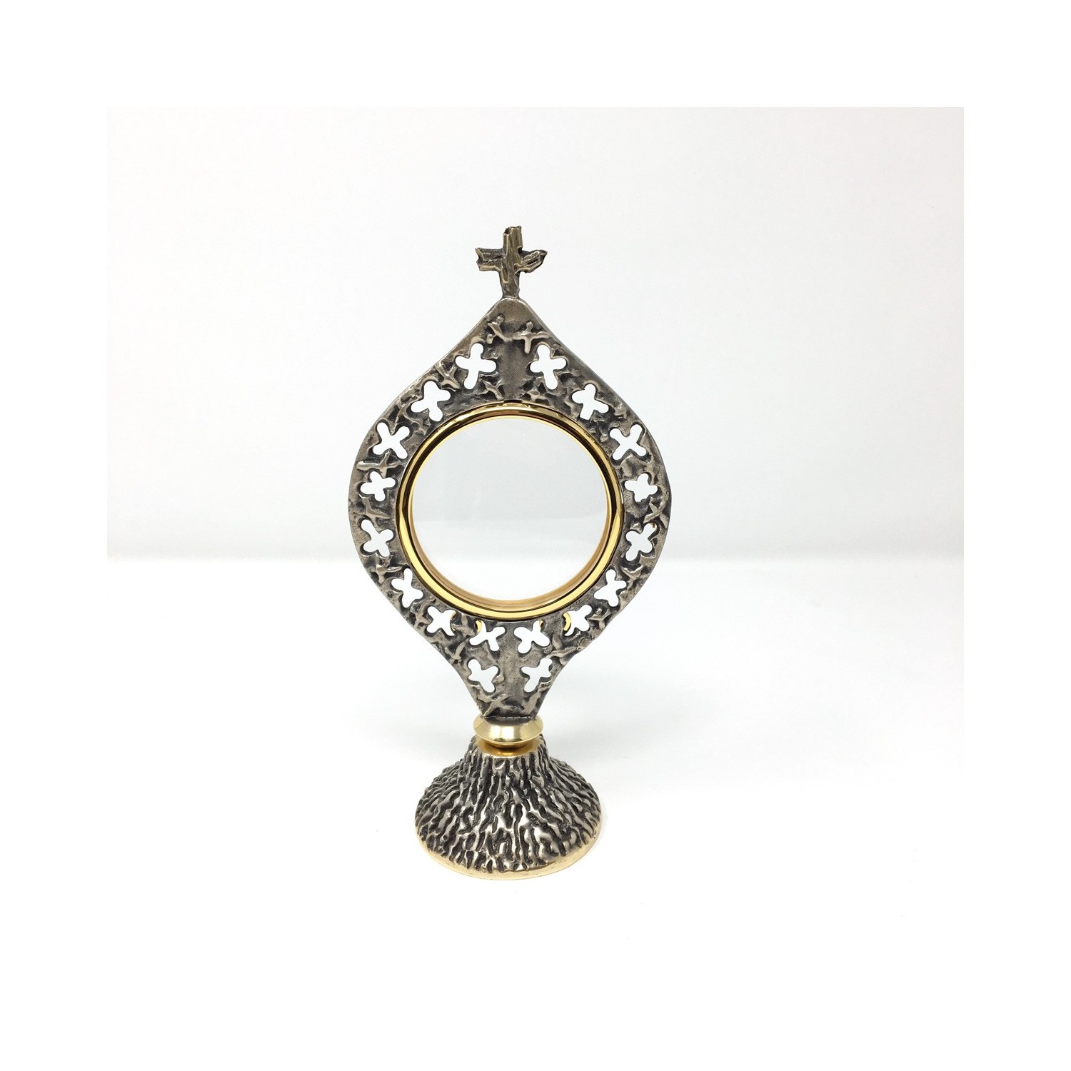Monstrance in brass and silvered bronze, small bronze halo with crosses.