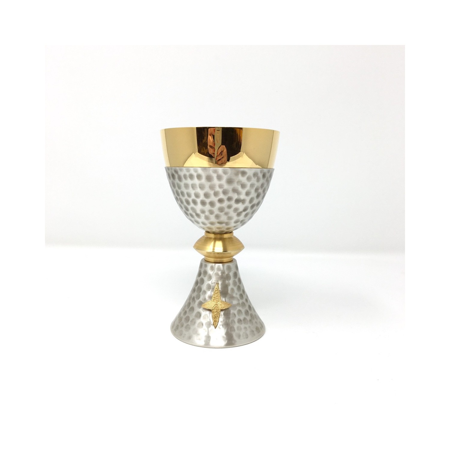 Chalice in silver-plated copper with hammered workmanship, cup in gilded brass, on the foot a small cross in gilded bronze.