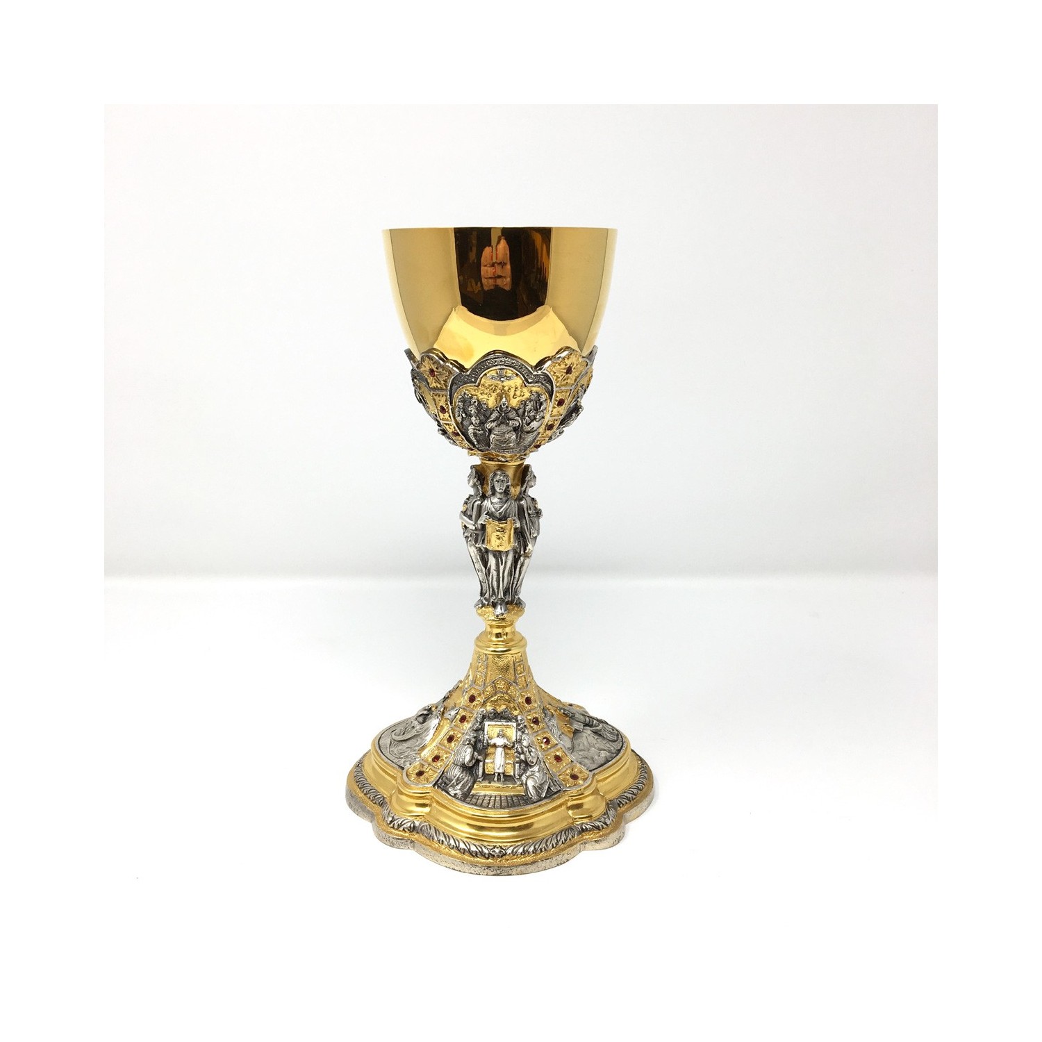 Chalice in silvered and gilded bronze, reliefs depicting the descent of the life of Jesus: crucifixion, last supper, nativity, Jesus among the priests, delivery of the keys to Peter, resurrection, Pentecost. With recessed regenerated rubies. Handcrafted in Italy.