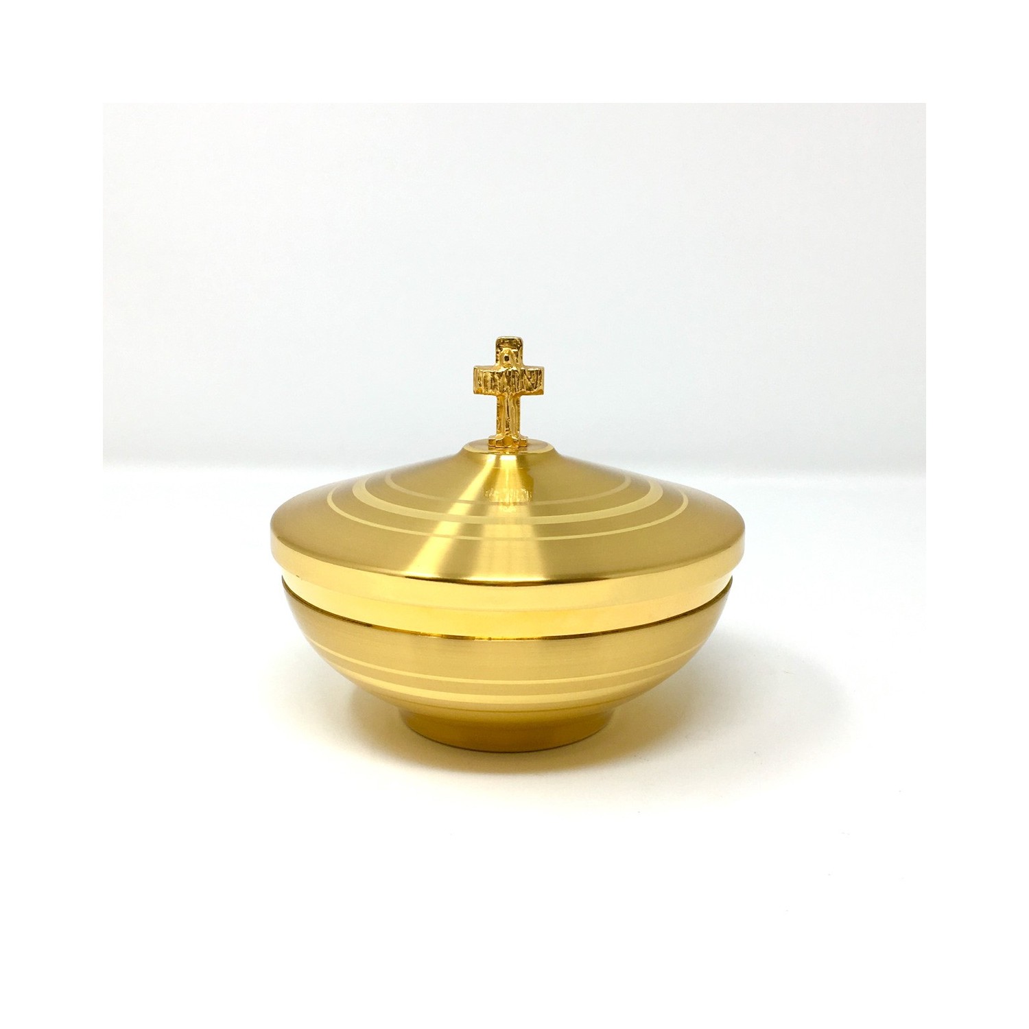 Ciborium paten in satin and shiny golden brass with stylized cross made in fusion.