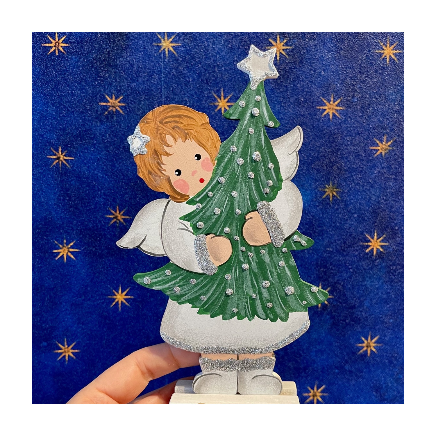 Angel with Christmas decoration, hand painted wooden stand