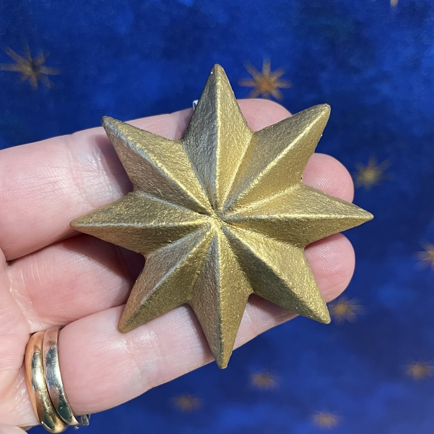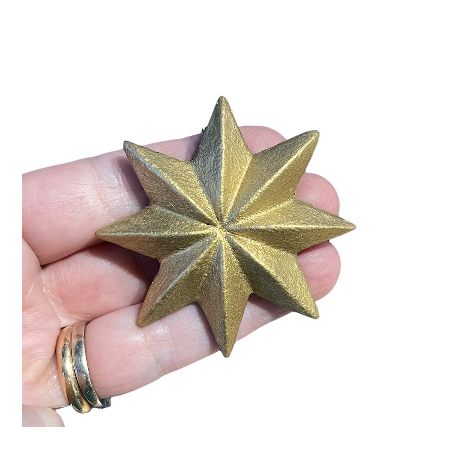 Comet Star for Petit Bethleem nativity scene, with hanging hook, diameter 6 cm. Pyrenean stone nativity scene produced by the Nuns of the order of Bethleem, in the monastery of Caux, France. The works produced by the nuns are reproductions of the Autun cathedral, or original productions that express the typical meditation of this order.