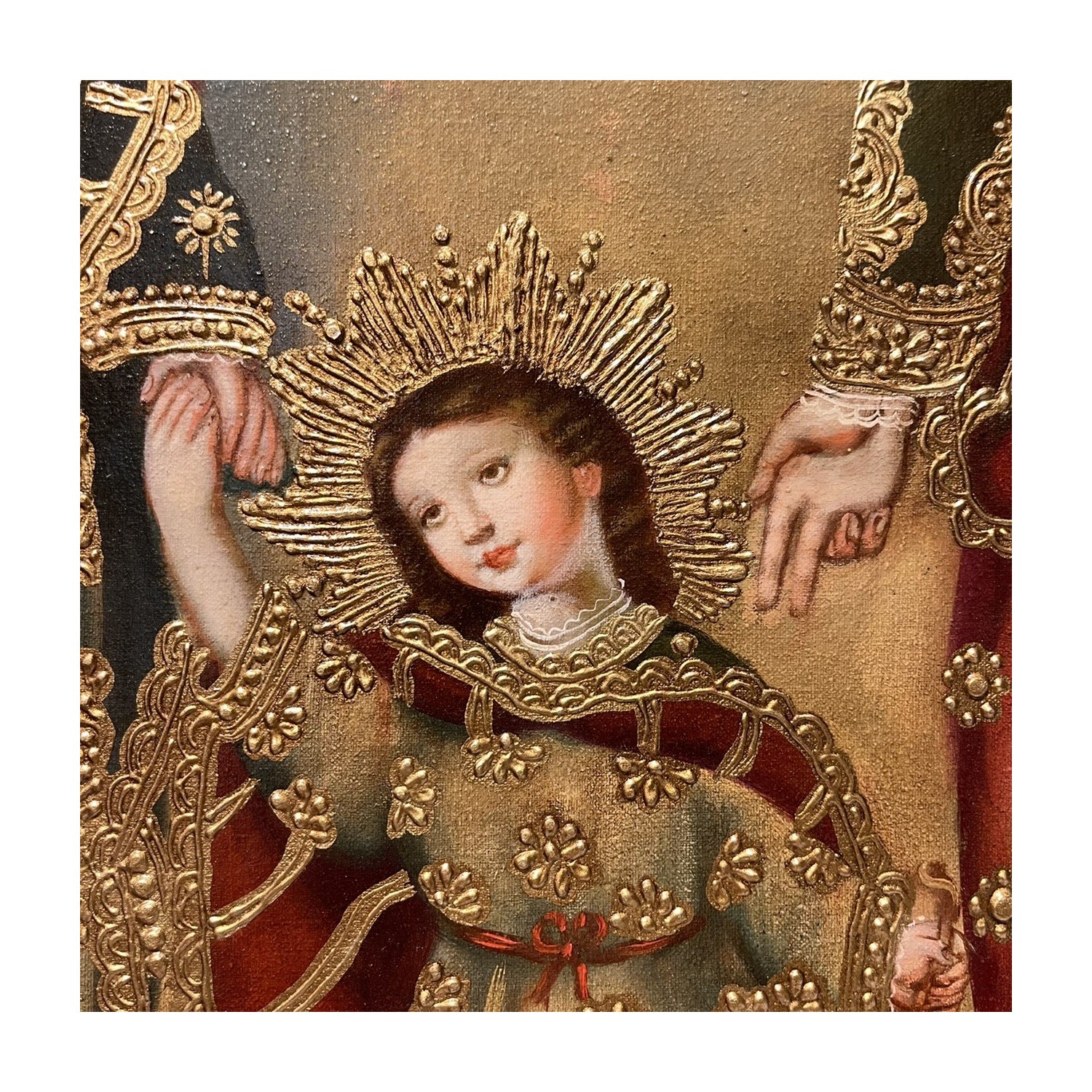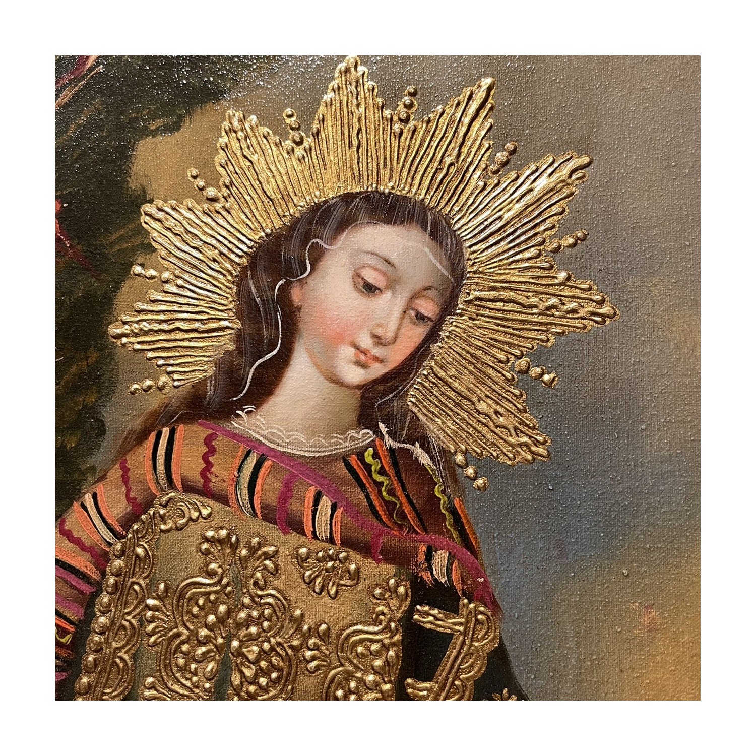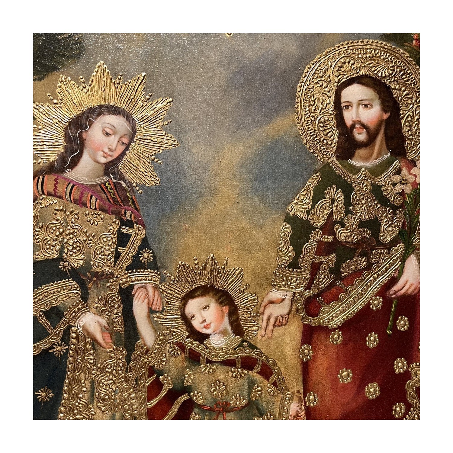 Holy Family. Hand painted canvas with oil colors, reproduction of the classic colonial baroque paintings present in the major cathedrals of Cutzco. The reproductions are cared for and executed by the best master painters and decorators in the workshops of Cutzco. The mixture of different cultures: the Spanish and Italian pictorial culture of sacred images of the seventeenth century, combined with the decorative art of Flemish works of art, with the addition of decorative elements of Andean culture, gives life to the artistic current called Colonial Baroque or Andean Baroque. Canvas size 30 X 40 cm.