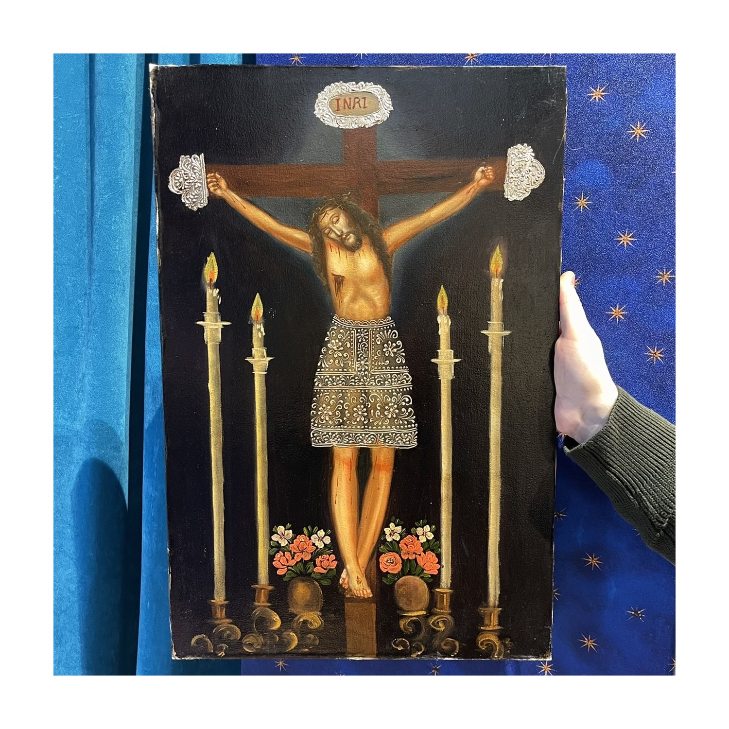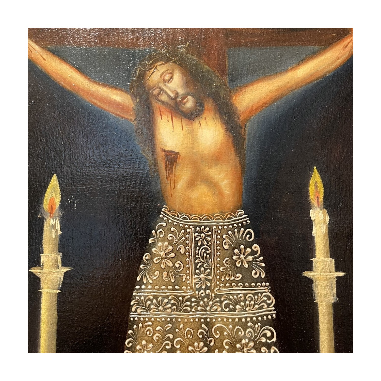 Crucified Christ. Hand painted canvas with oil colors, reproduction of the classic colonial baroque paintings present in the major cathedrals of Cutzco. The reproductions are cared for and executed by the best master painters and decorators in the workshops of Cutzco. The mixture of different cultures: the Spanish and Italian pictorial culture of sacred images of the seventeenth century, combined with the decorative art of Flemish works of art, with the addition of decorative elements of Andean culture, gives life to the artistic current called Colonial Baroque or Andean Baroque. Canvas size 30 X 40 cm.