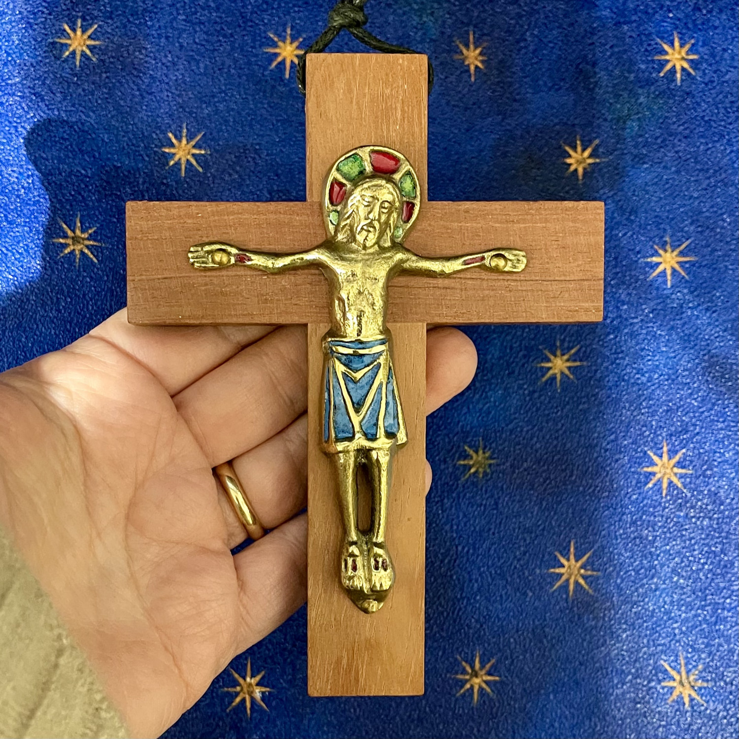 Gilt bronze Crucifix with fire enamel and wood cross.