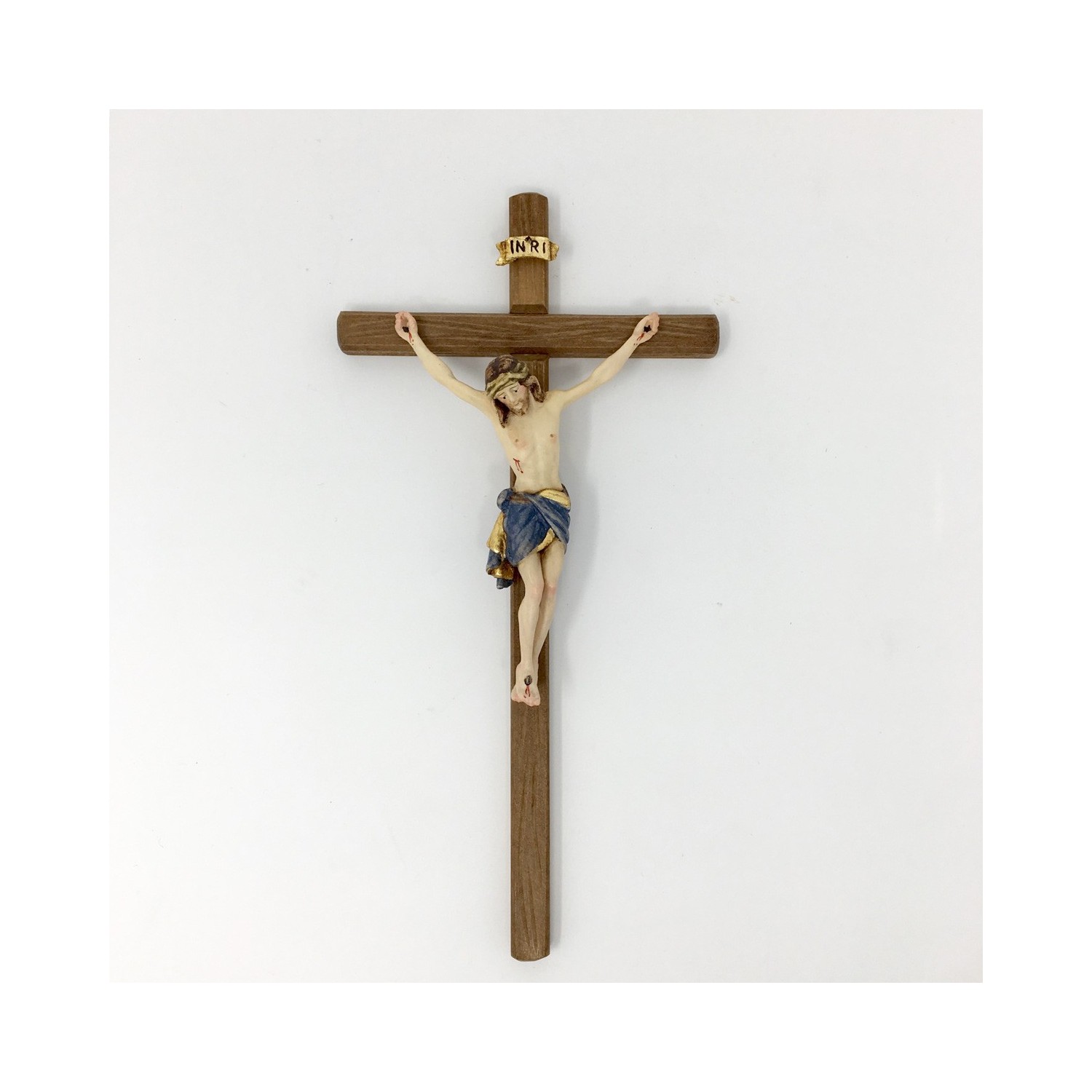 Crucifix in wood carved and hand painted by the master sculptors in Val Gardena. Painted with oil colors, to hang.