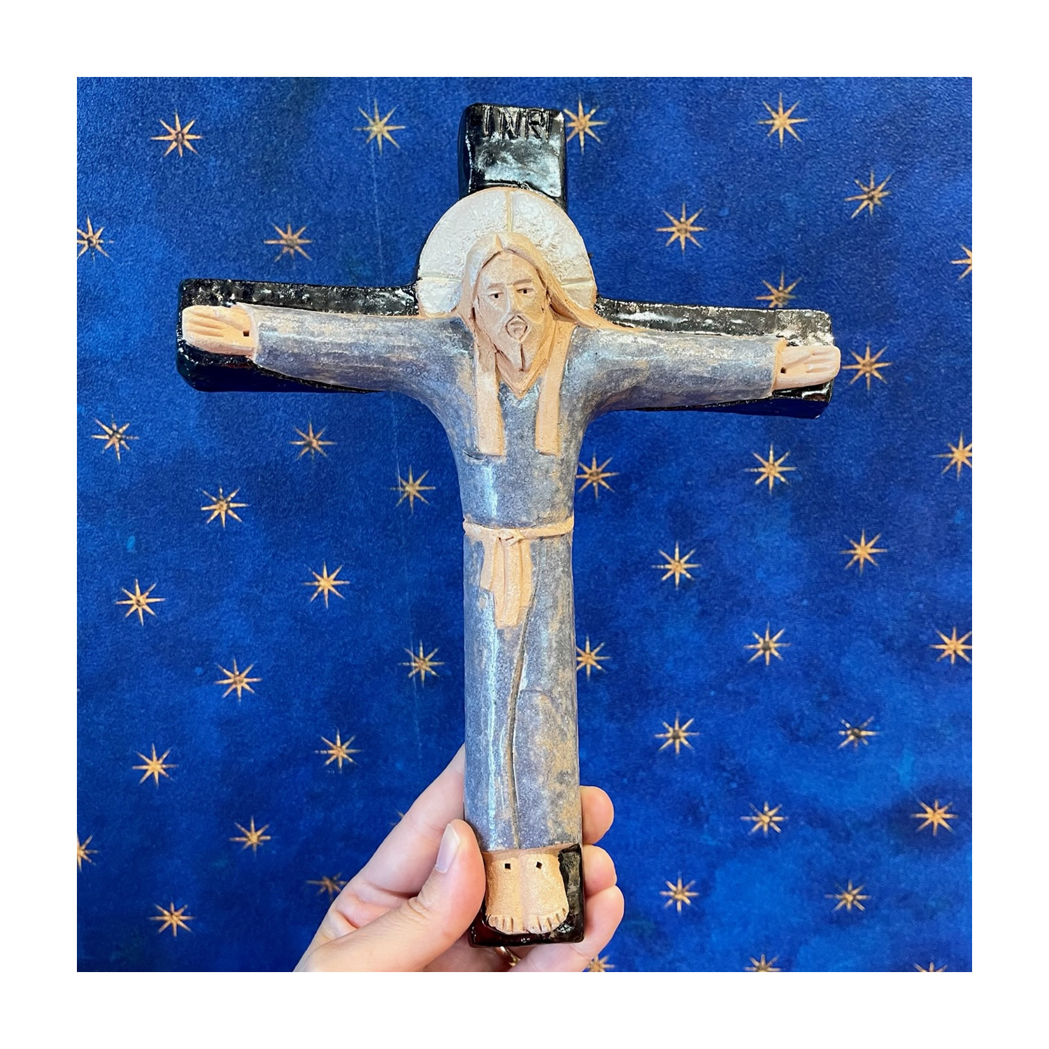Crucifix in gilded bronze, stylized line, handmade in Italy, to hang.