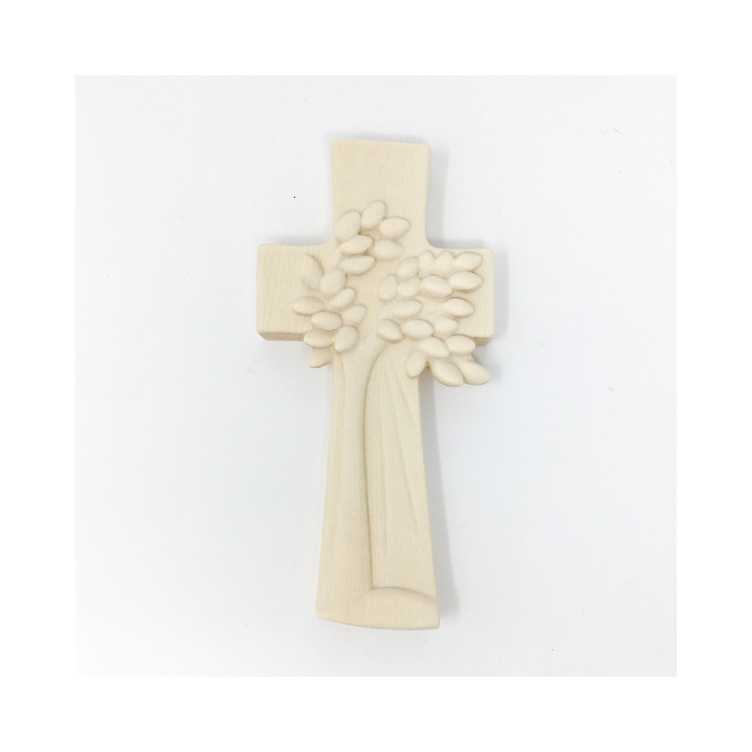 Natural white maple wood cross, represents the tree of life. Hand sculpted by master sculptors in Val Gardena.
