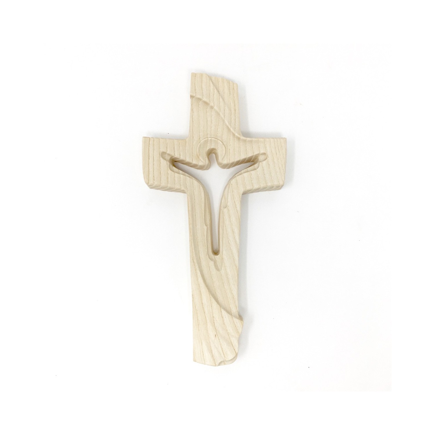 Resurrected crucifix negative carved in a maple cross, natural finish, hand-sculpted by master sculptors from Val Gardena.