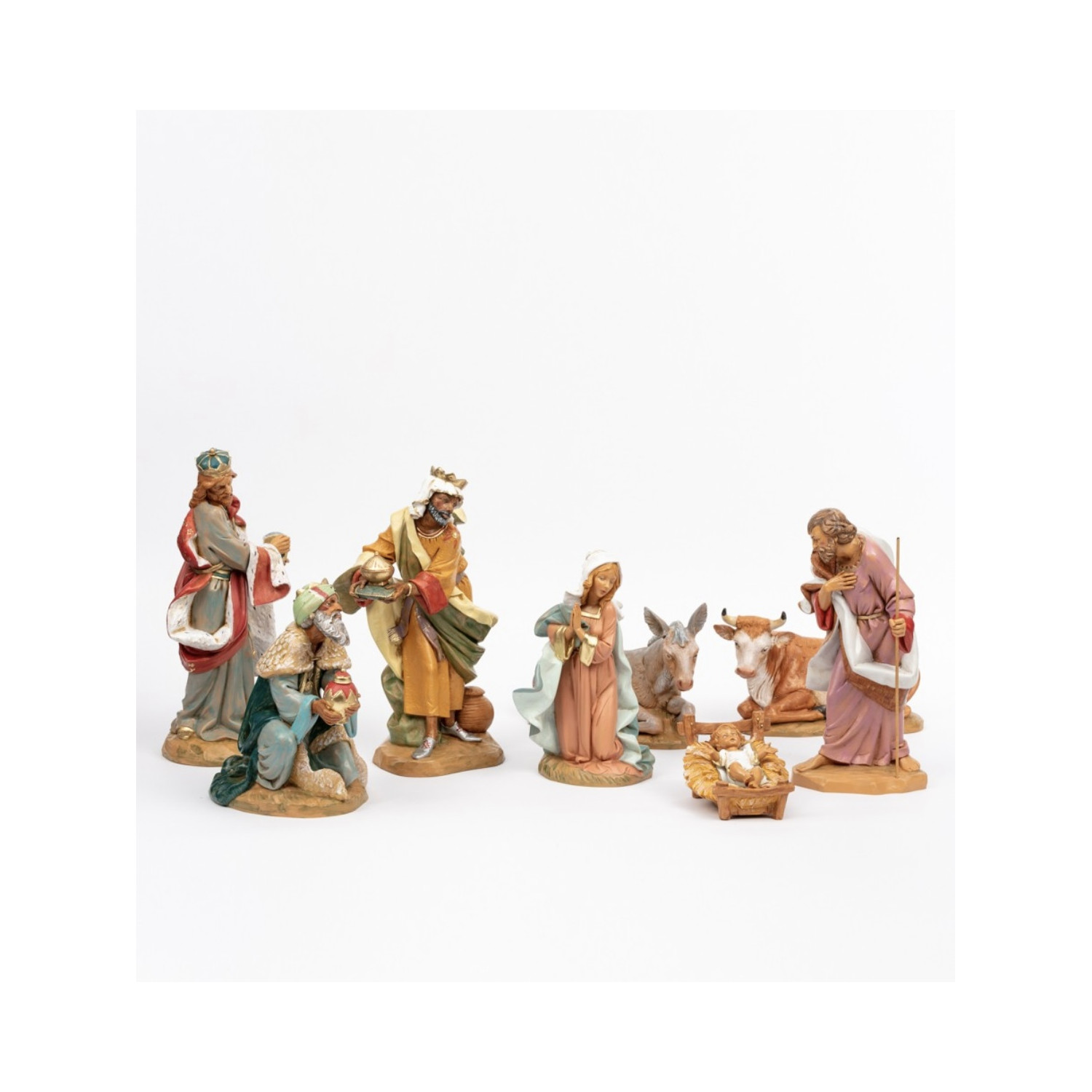 nativity donkey, ox and magi in plastic resin with wood-like coloring by Fontanini. Fontanini is a Tuscan company that has been producing cribs for over 100 years, completely made in Italy. Fontanini cribs are synonymous with quality and tradition. Tricella has been selling Fontanini cribs for over 60 years. scale 30cm