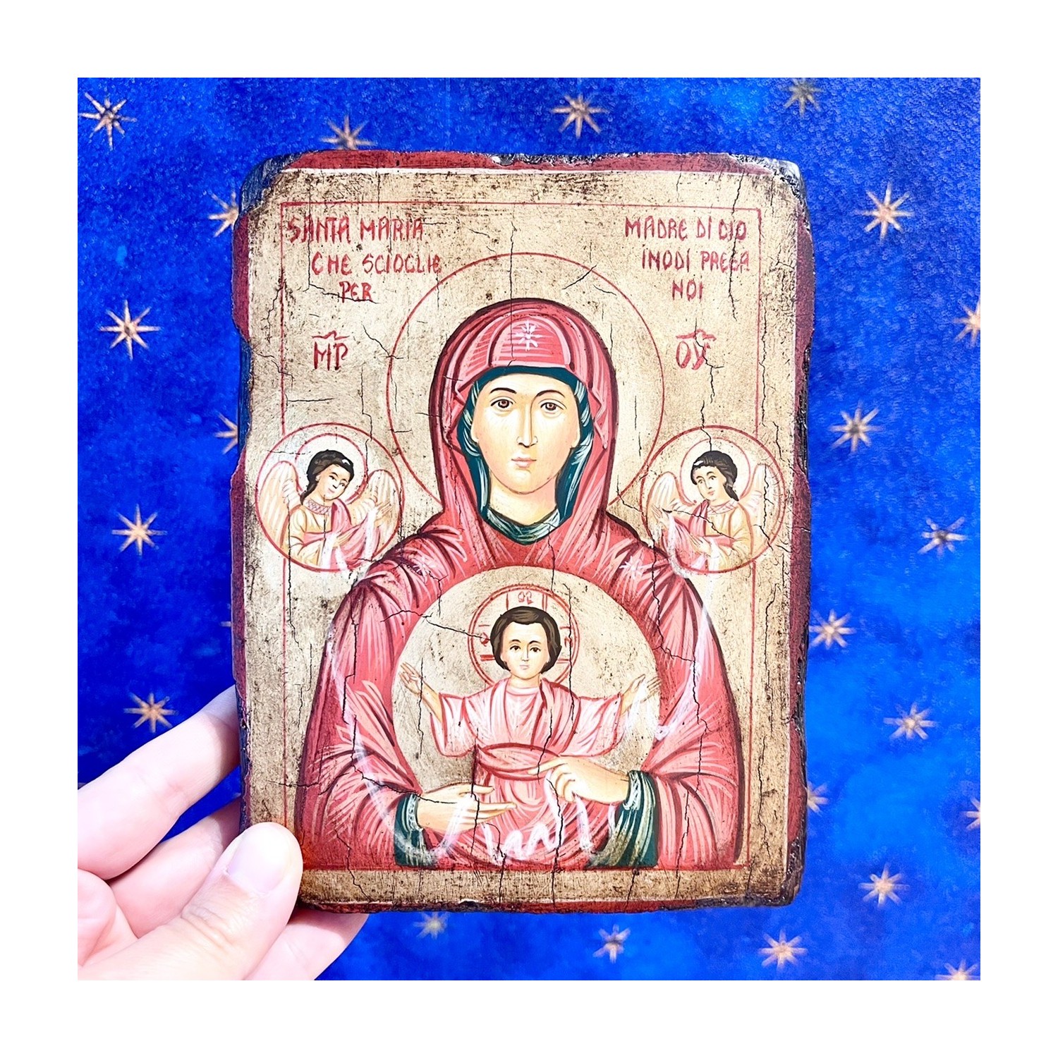 Hand-painted icon depicting Mary Untying the Knots. This icon is a reinterpretation of the famous painting, so dear to Pope Francis, elaborated following the iconographic typology "Mother of God of the Sign, with the Child Jesus positioned frontally, superimposed on the Madonna; this iconographic typology underlines the role of the Madonna as mediator between God and Men.