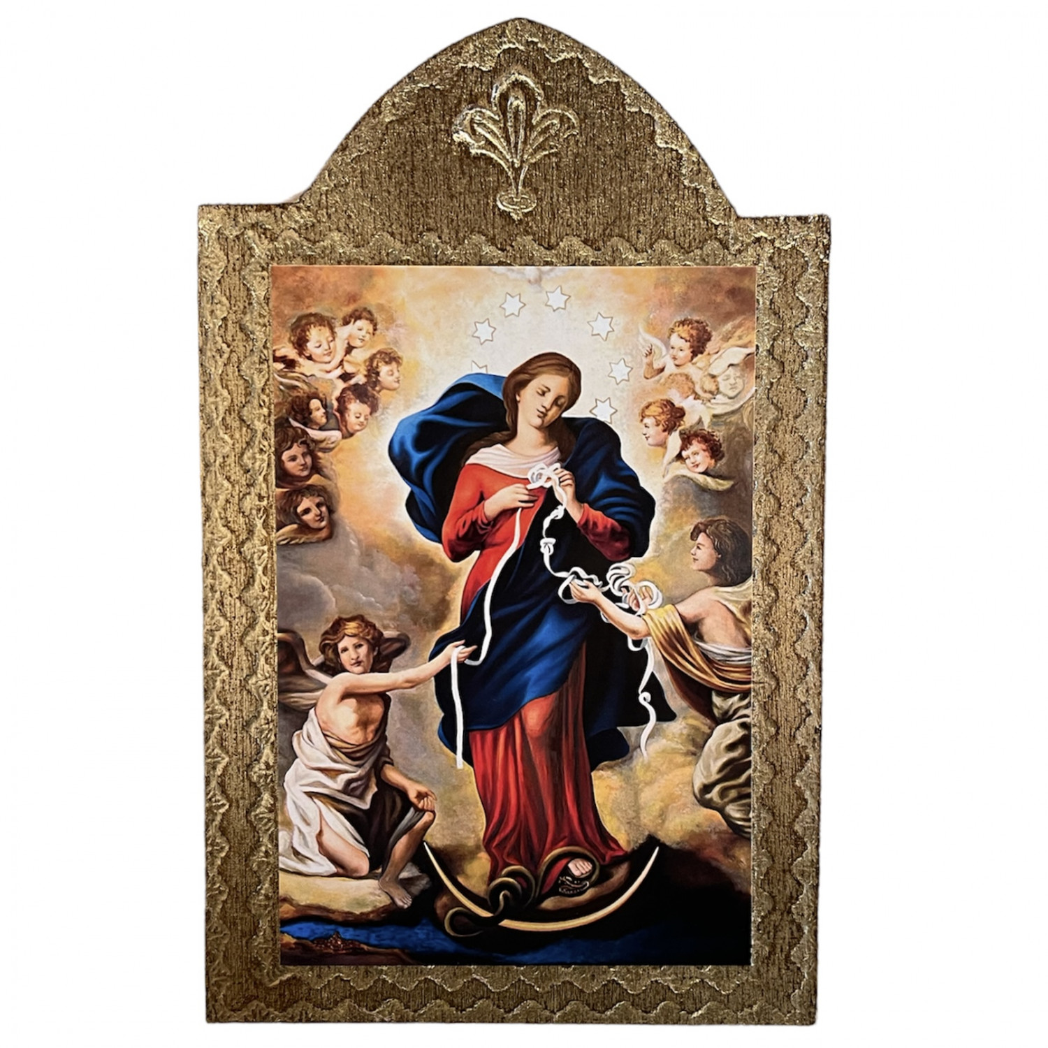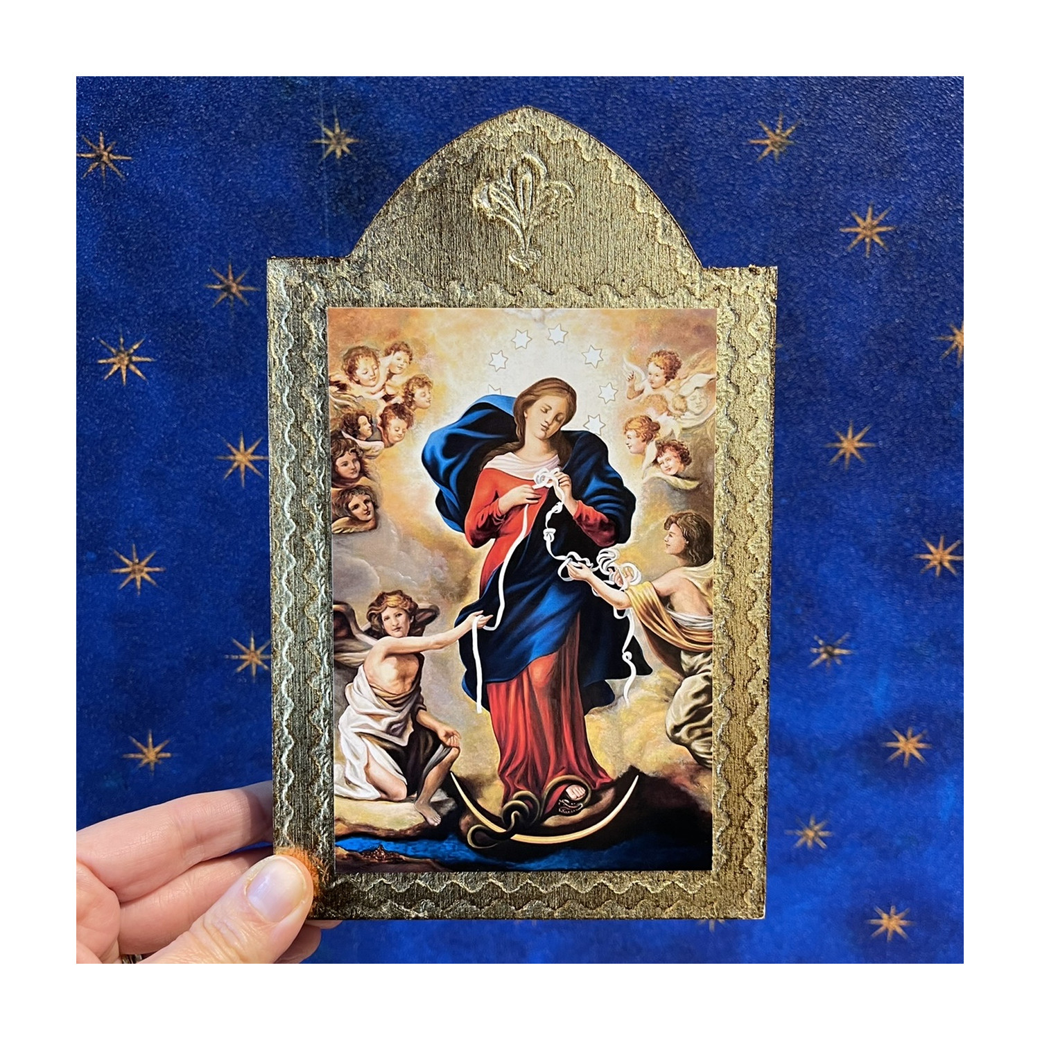 Wooden hanging table with image shown and gold leaf background.