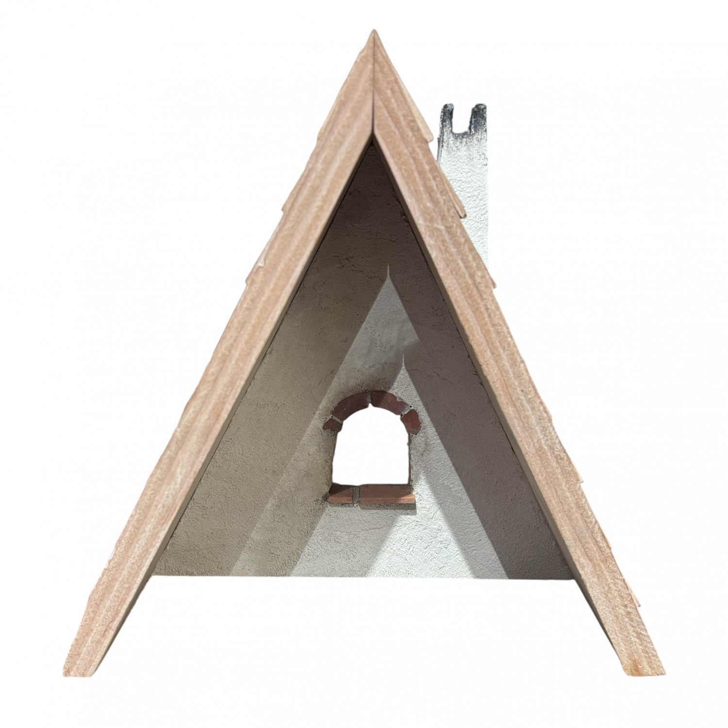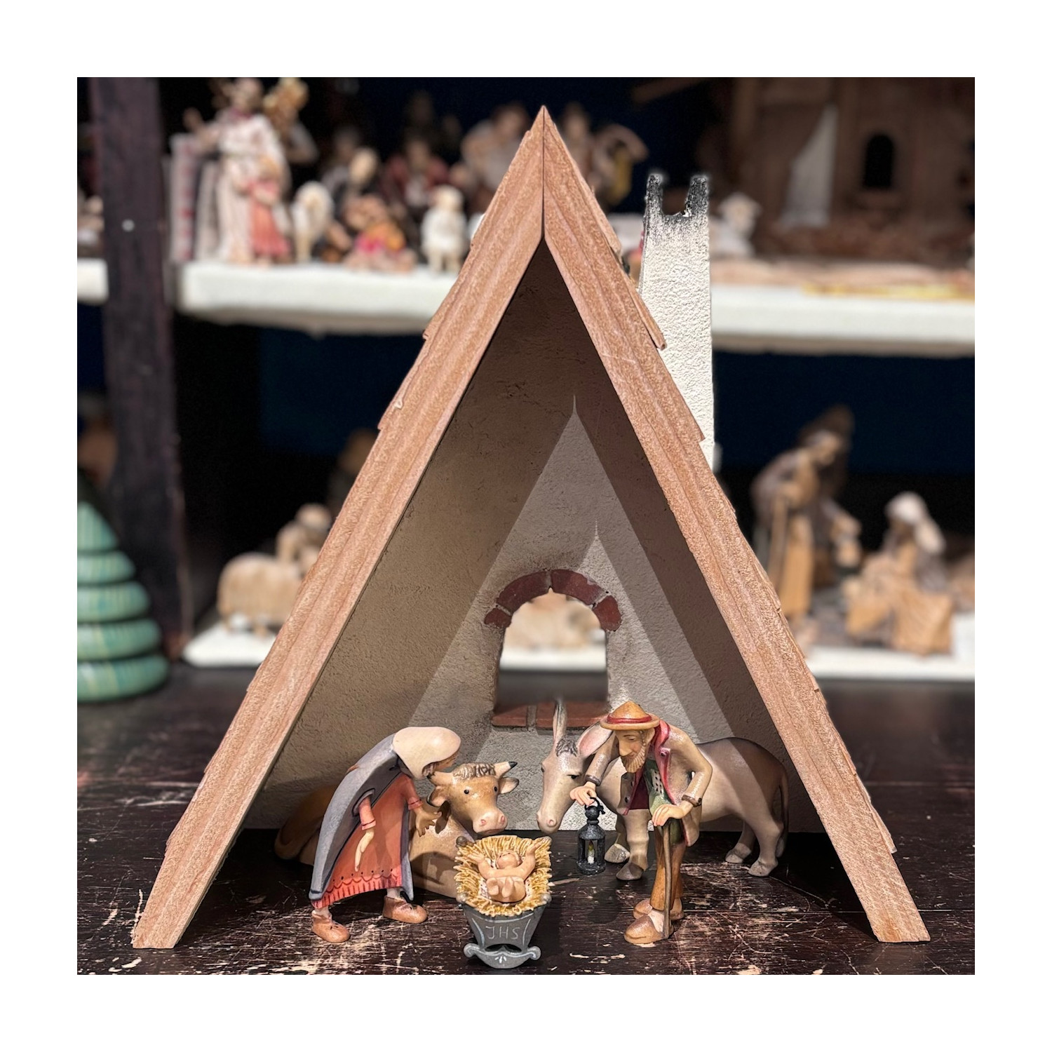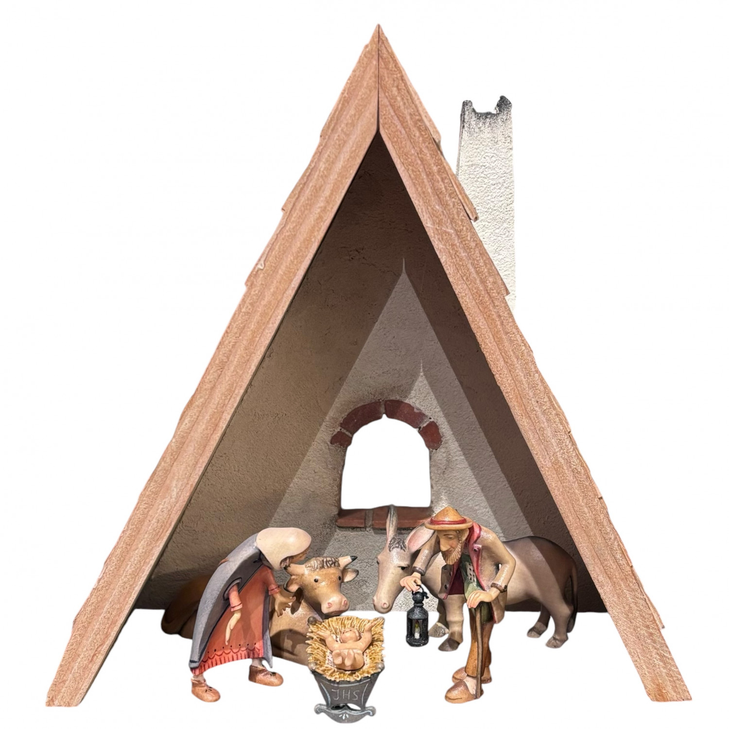 Kastunger nativity scene hut, 8 cm scale; dimensions: 27X27X14. Nativity scene in maple wood, carved and hand painted with oil colors in Val Gardena; work of the sculptor Harald Kastlunger and made by the Lepi company.