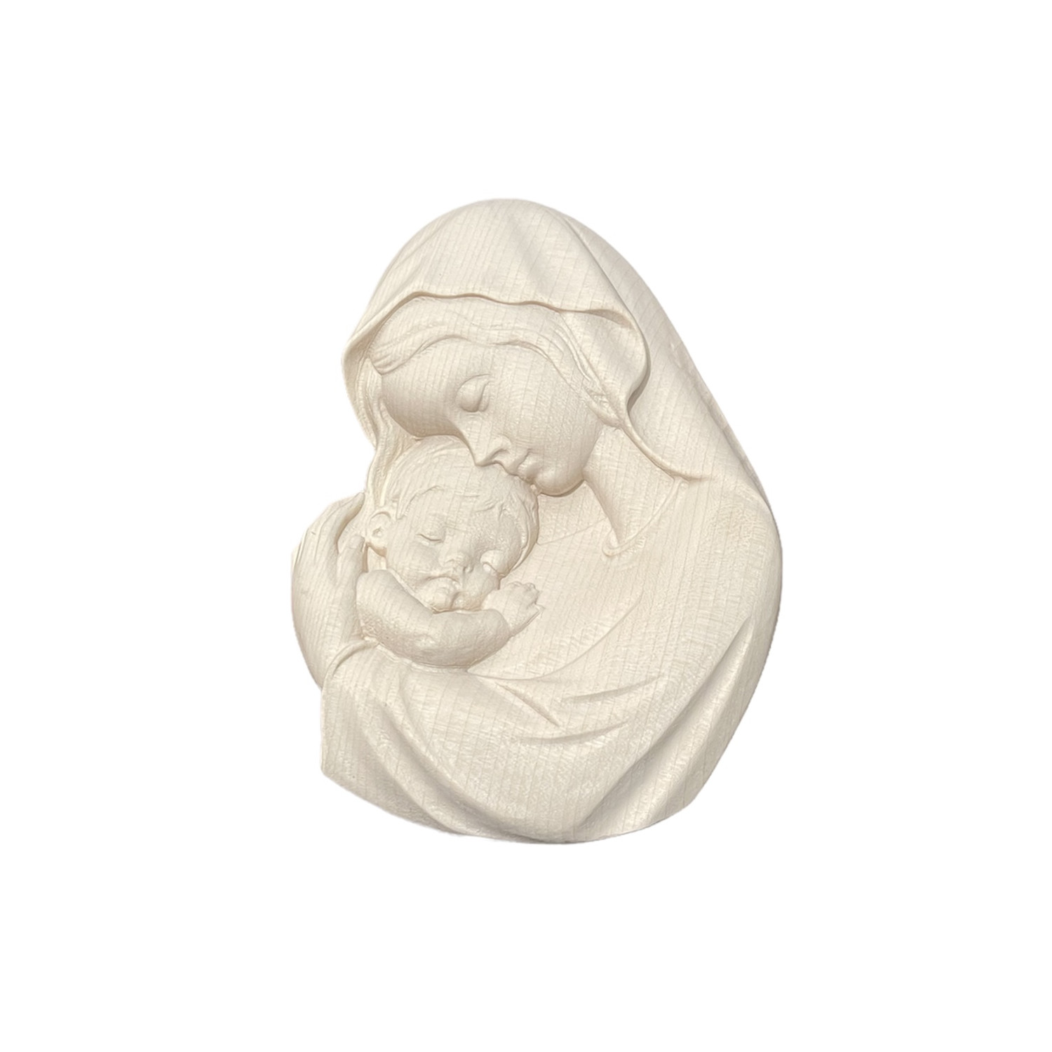 Madonna with Child relief in wood carved by hand in Val Gardena, to hang.