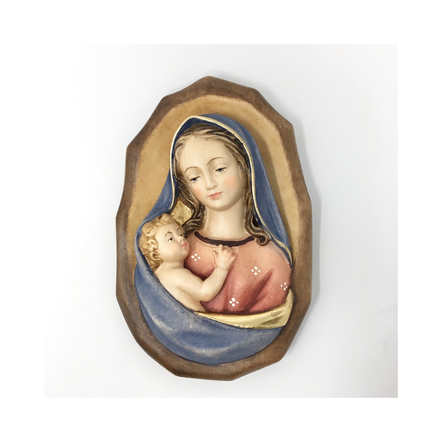 Madonna with Child relief in wood carved by hand in Val Gardena, to hang.