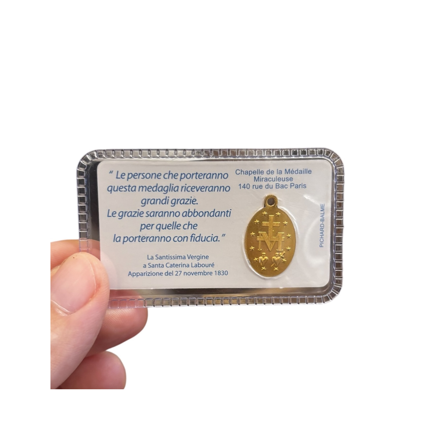Laminated card with miraculous medal, complete with prayer and citation, original from the Chapel of the Miraculous Medal in Paris.