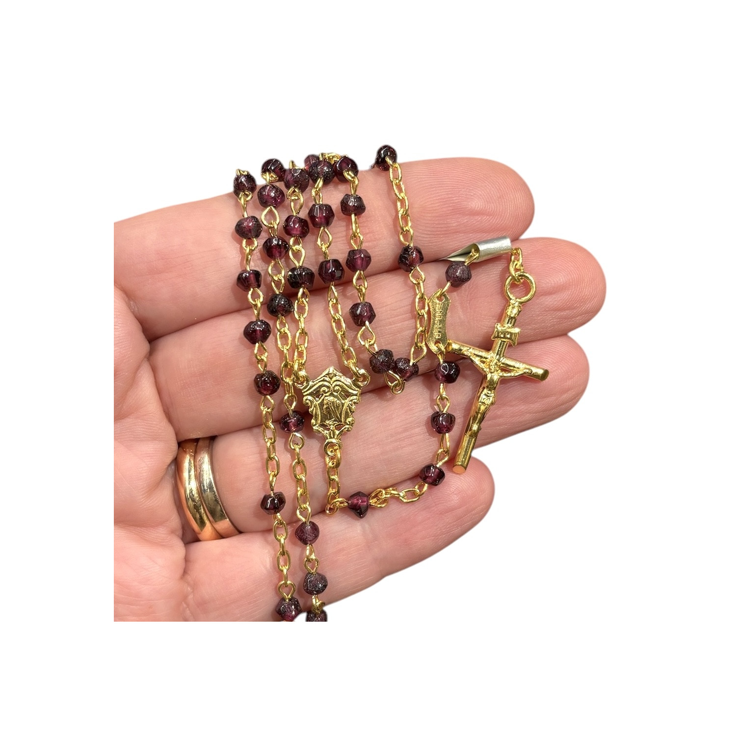 925 silver rosary with round grain carabiner in hard stone, faceted garnet, 3 mm; cross and cross in silver. This rosary has a central carabiner which makes it wearable. The Holy Rosary, the most widespread prayer that popular tradition has given us, has consecrated over the centuries the humblest aspect of Our Lady's life. By reciting it, it is as if the figure of Mary imposes itself in its simplest and most hidden aspect. "Luigi Giussani"