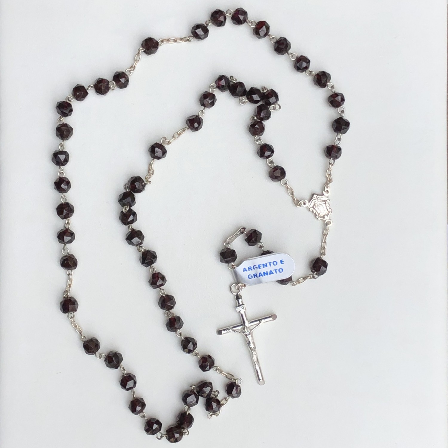 Rosary in 925 silver and faceted garnet, cross and cross in silver, grain 6 mm