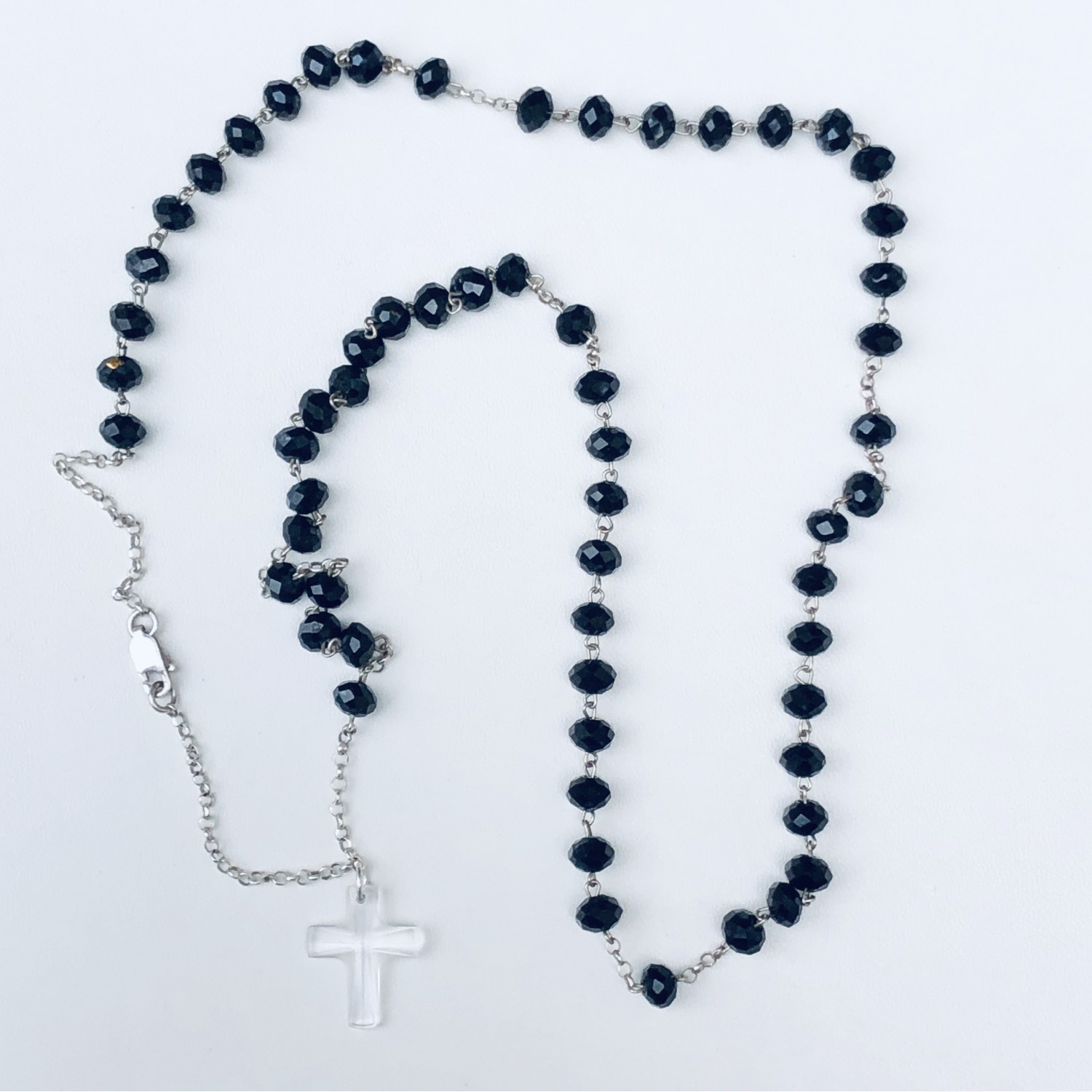 Eternal rosary necklace in silver and black crystal, silver chain and cross. Grain 6 mm. The eternal rosary is a rosary that has five circular decades; it can be worn indifferently on the wrist (making several turns) or around the neck. This rosary has black swarovsky crystal beads, a white svarovsky crystal cross and a 925 silver binding.
