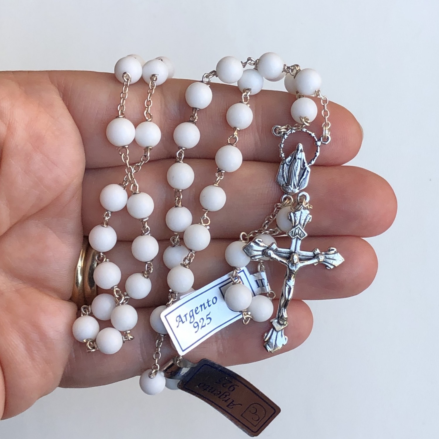 Rosary in silver and shell. Cross and cross in silver. Eternal binding. Grain 6 mm. This rosary, thanks to the eternal binding, is particularly robust and suitable for prayer; it is long enough to be worn around the neck (circular part linear 59 cm, suitable for both men and women). It can be customized on request. Among the original inhabitants of the Americas, shells and snails have always been sources of inspiration and key elements in the decoration of jewelry and ritual objects. Shells have always been considered a symbol of fertility and regeneration of life. The shells and pearls coming from the water, vital fluid for the development of life, are symbols of supernatural power.
