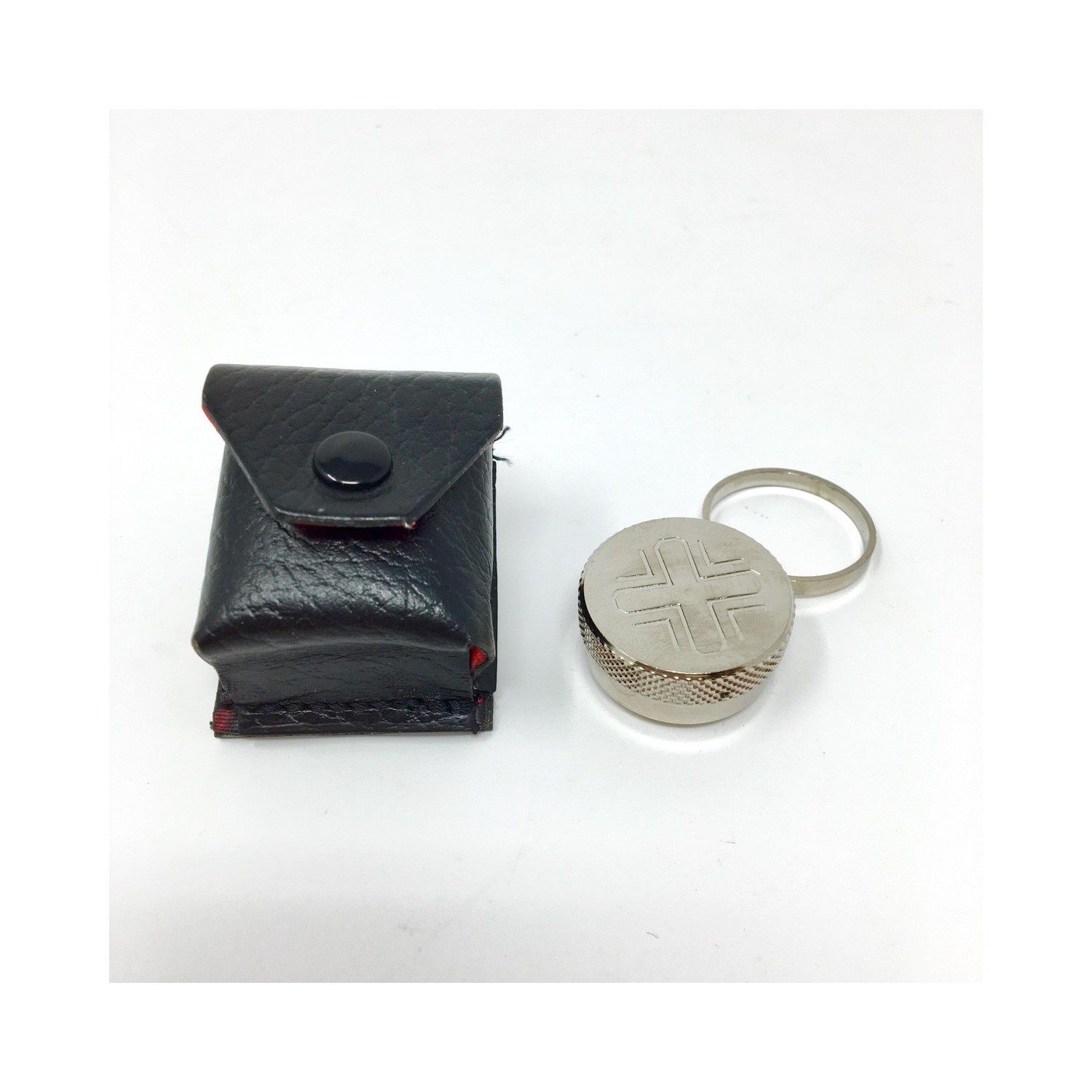 Nickel-plated brass jar for holy oil with removable ring, with small case.