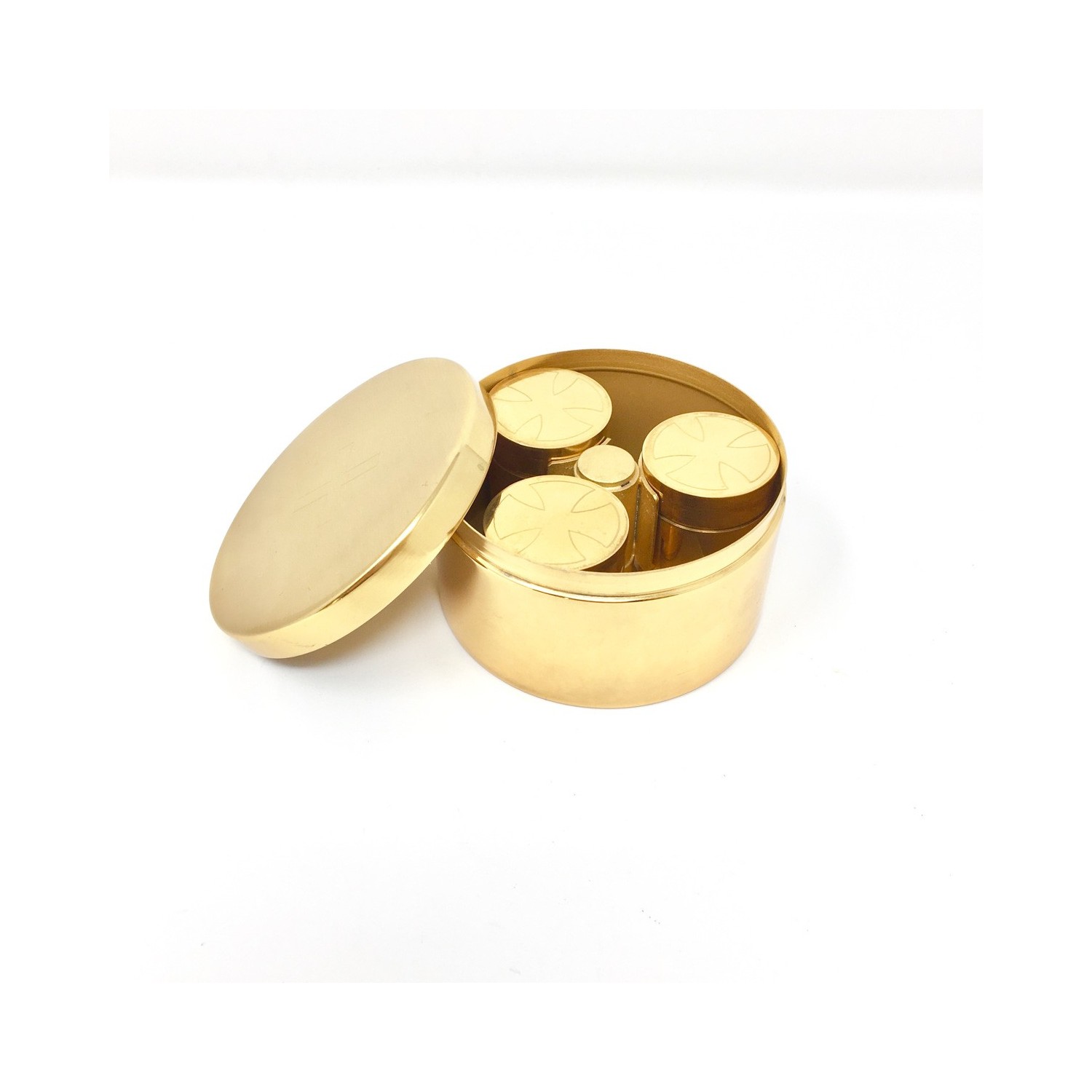 Set of holy oils in a golden brass case, handcrafted in Italy.