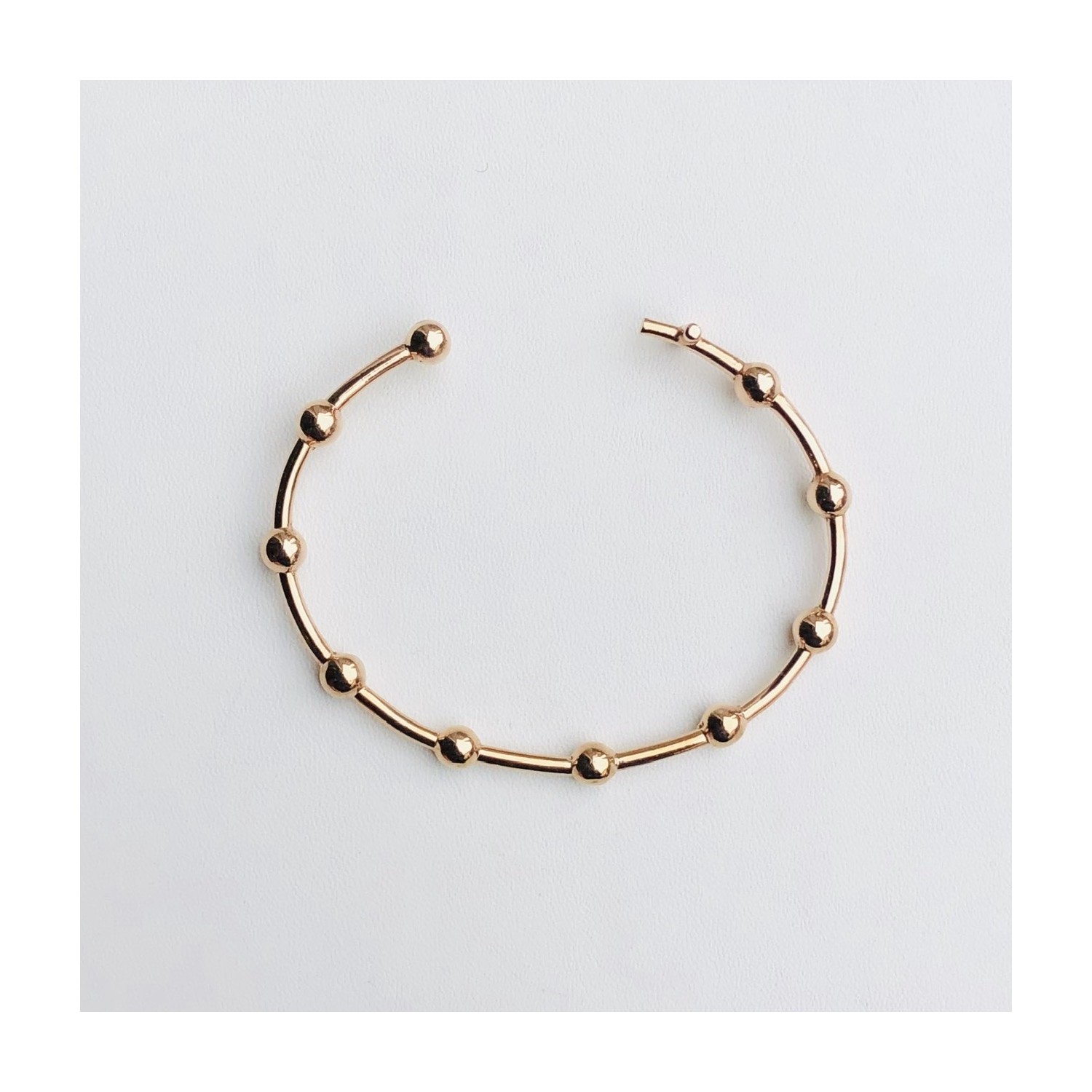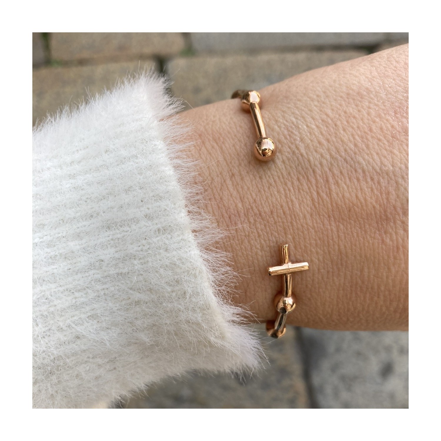 Rigid bracelet in 925 rosé silver, created in casting, exclusive Tricella model, 10 beads to recite the Holy Rosary, each grain is associated with a meaning, a gift for oneself and for others: joy - faith - perseverance - sharing - compassion - courage - hope - gratuitousness - gratitude - peace. It ends with the cross, a symbol of faith and resurrection. Size suitable for all wrists, both men and women.
