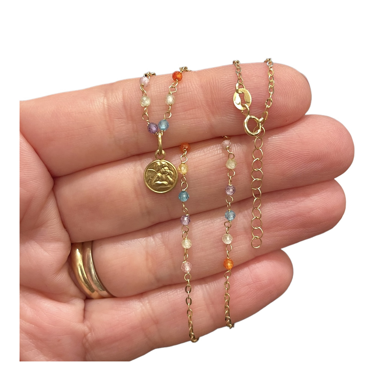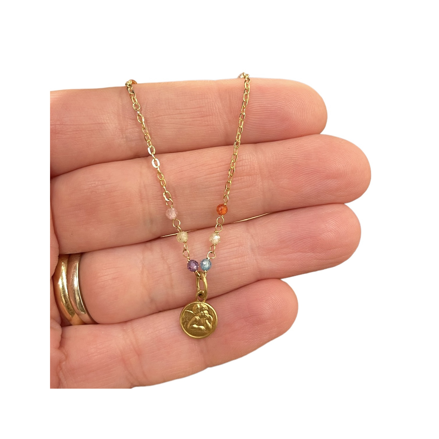 Choker necklace in 18-karat gold and colored sapphires with Guardian Angel medal pendant.