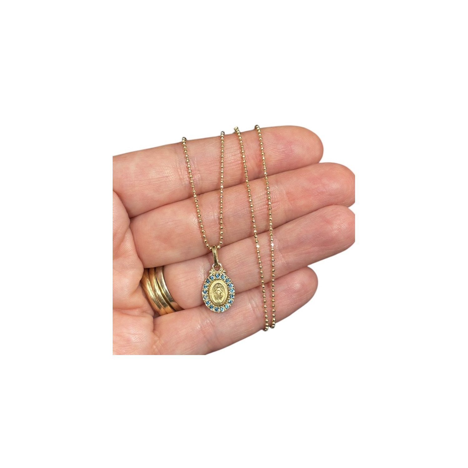 Choker chain, singapore link in 925 gilded silver, length 44 cm with Miraculous Medal in gilded silver with embedded zircons. The Miraculous Medal is the most widespread medal in the world. Wanted by the Virgin Mary, who appeared to Santa Caterina Labourè in the convent of Paris in Rue du Bac; the Madonna herself described how the minting of the medal itself must have been; rich in symbols and meaning, the miraculous medal, through the intercession of Mary, gives numerous graces to those who wear it with faith.