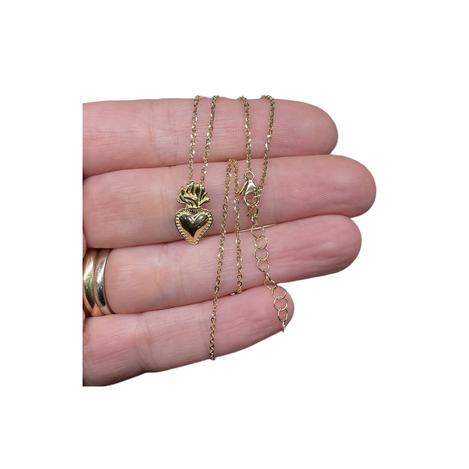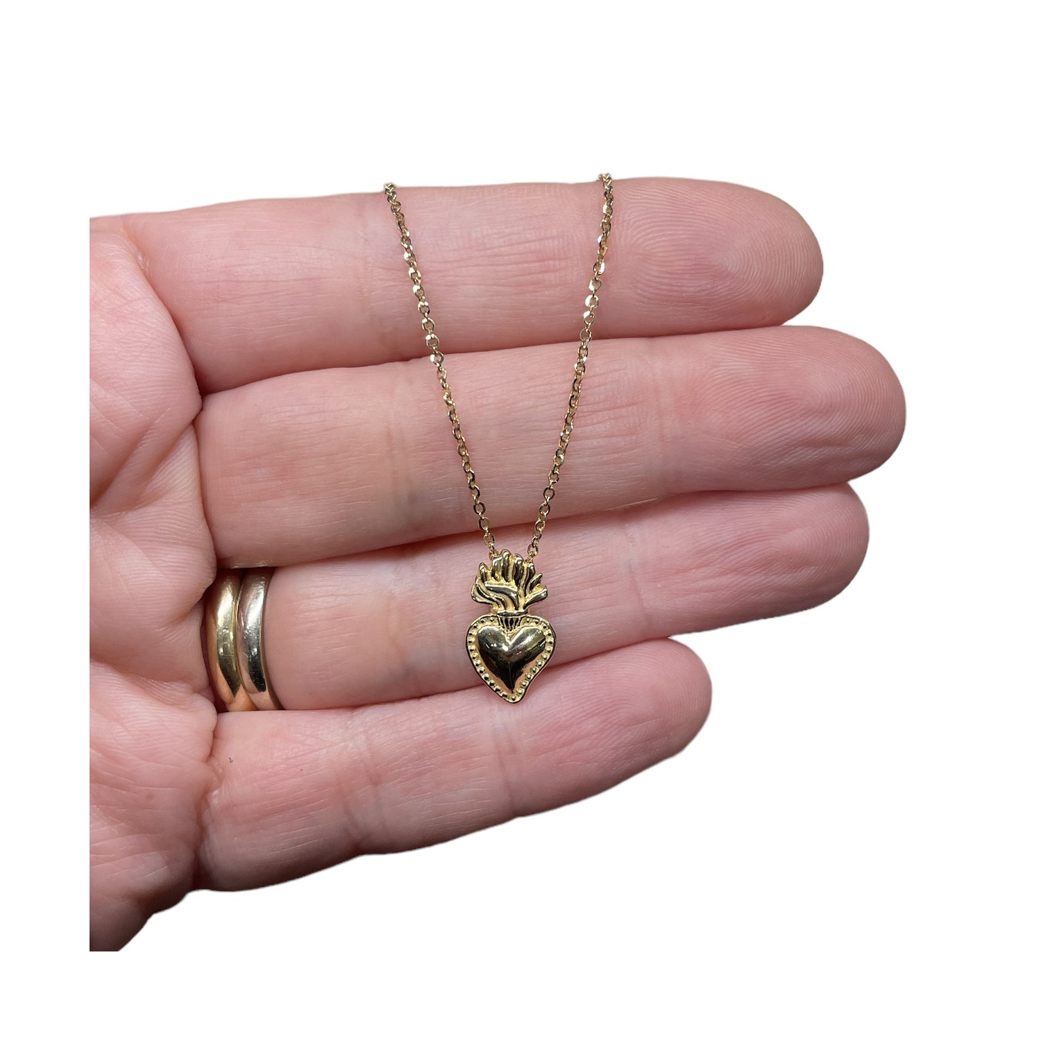 Necklace necklace in 18K gold and stones. The ex voto pendant, in 18 carat gold with hidden hook, can be taken off, so that the two elements that make up this necklace can also be used separately. The length of the necklace is 42 cm. The flamed heart, commonly called sacred heart, is a miniature reproduction of an ex voto heart, traditionally offered as a sign and thanksgiving following a vow and a grace received. Not to be confused with the "Sacred Heart" of Jesus or Mary, which besides having the flame is surrounded by a crown of thorns (Jesus) and a crown of flowers (Mary).