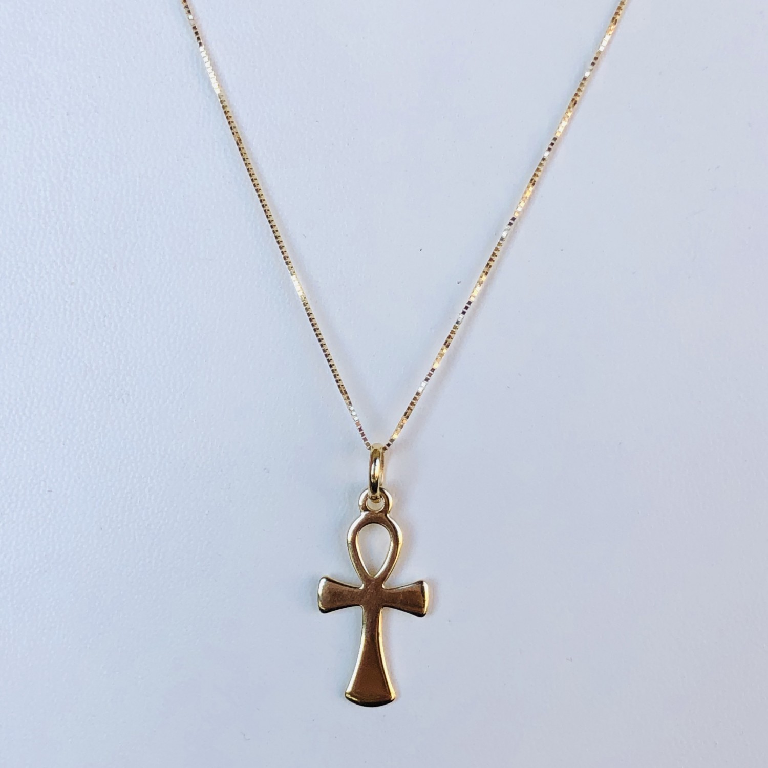 Venetian chain link, length 45 cm. Egyptian cross, length 25 mm, all in 18 carat gold.