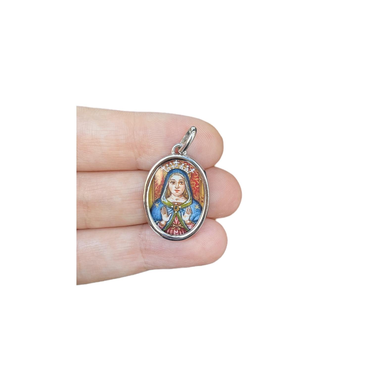 Madonna delle Grazie medal with 925 silver bezel and miniature oil on a fossil ivory plate.