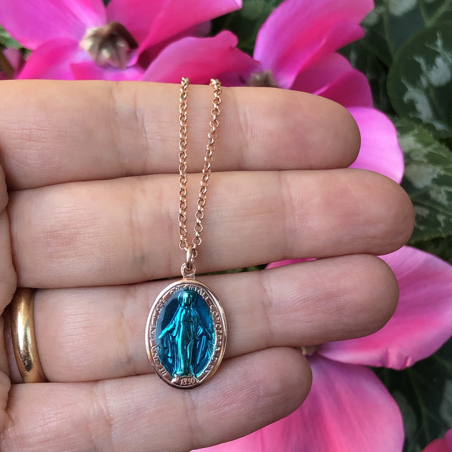 925 rosegold silver necklace with large enamelled miraculous medal.