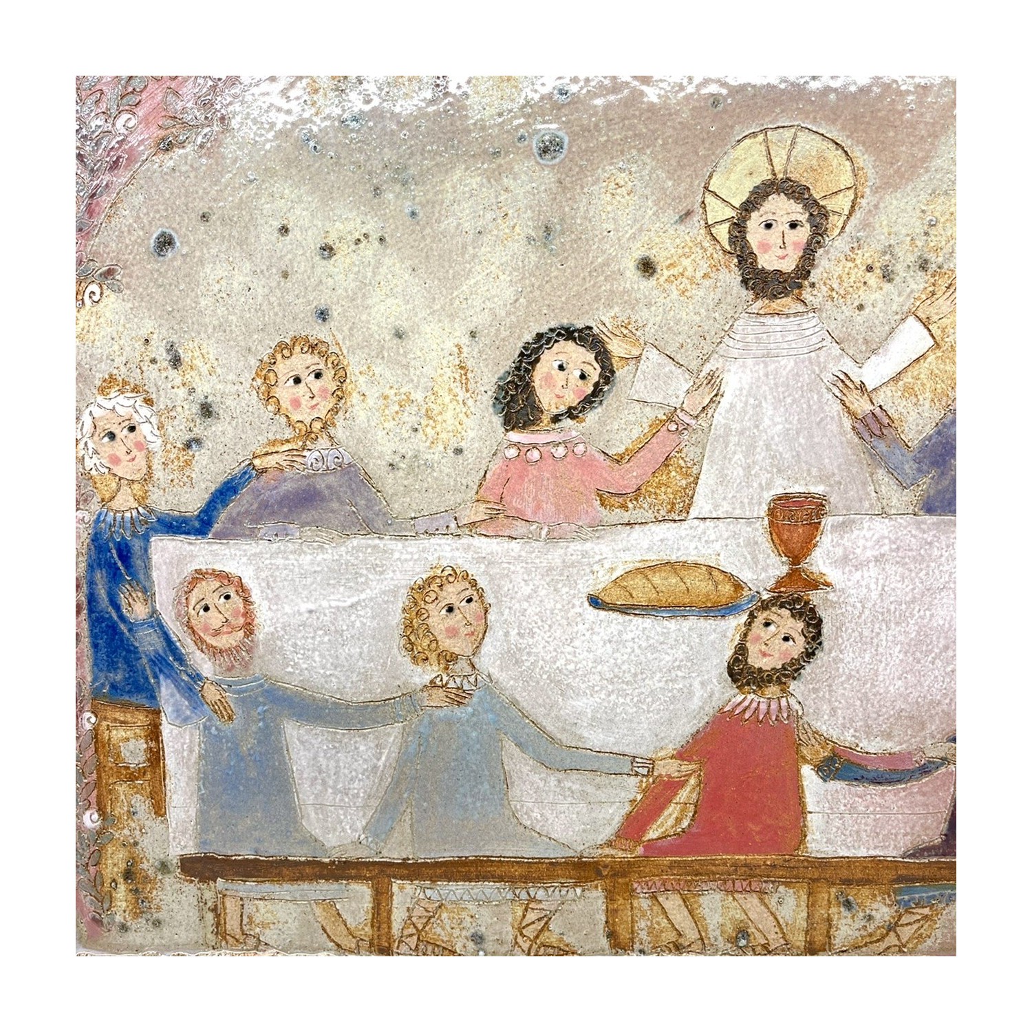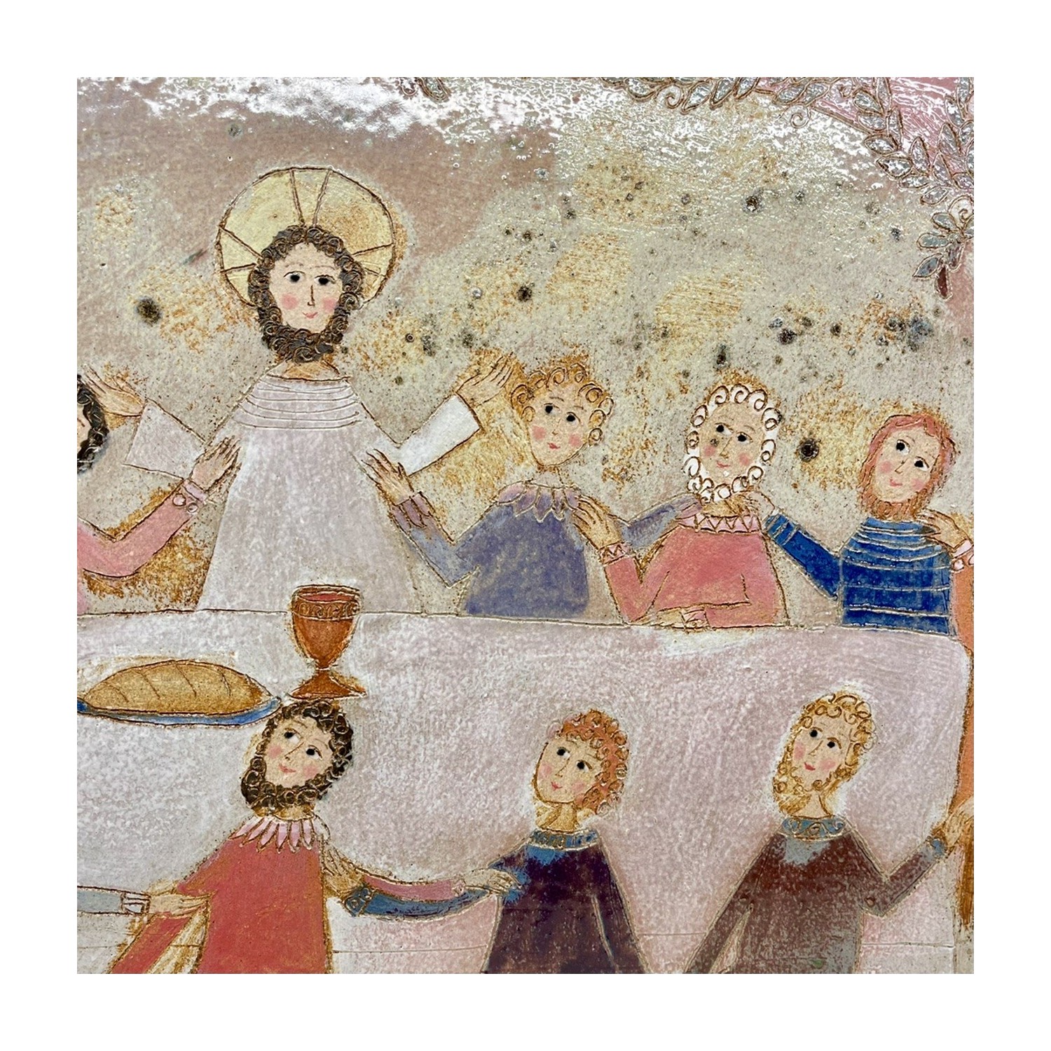 Handmade stoneware panel depicting the last supper.