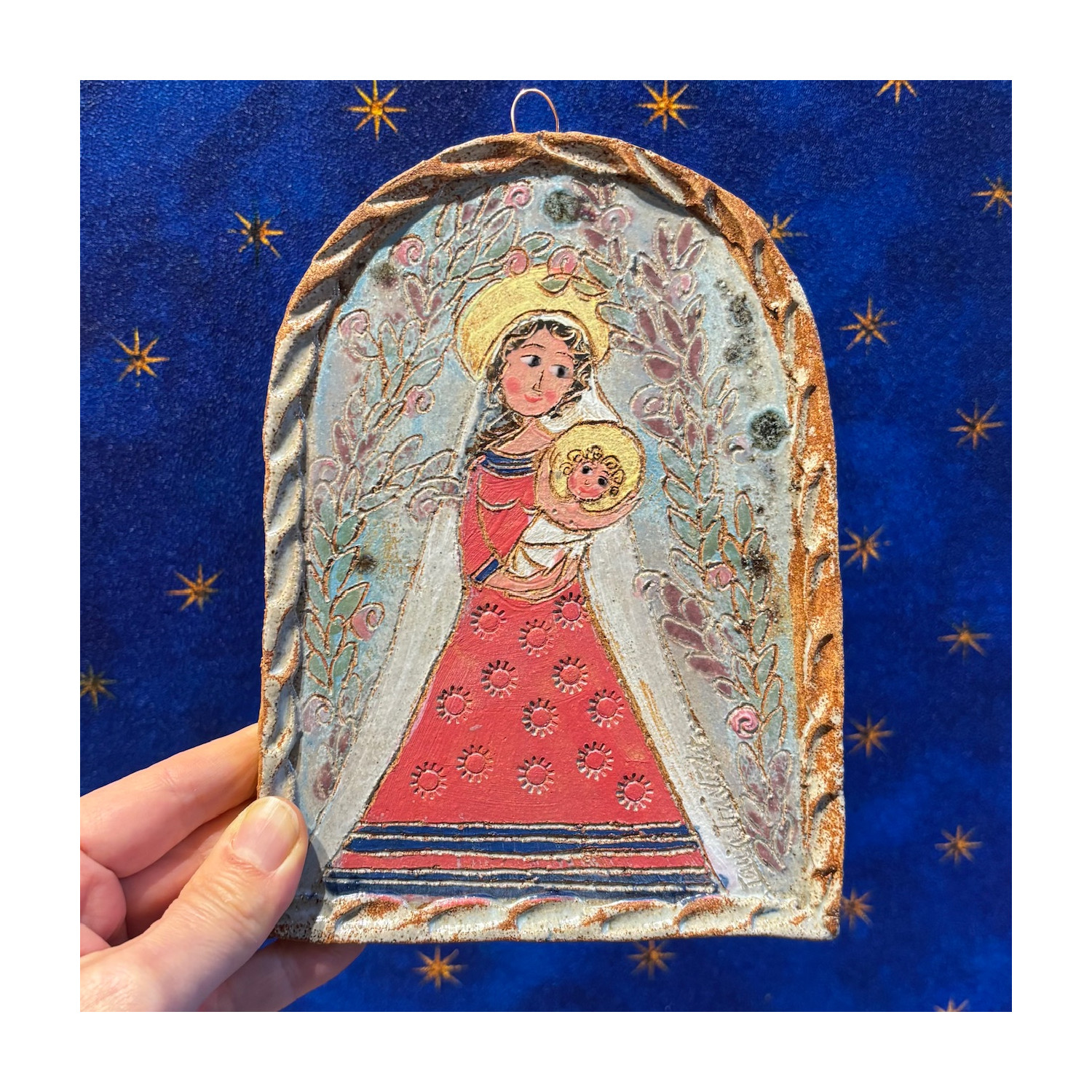 Madonna with Child, to hang in hand made stoneware.