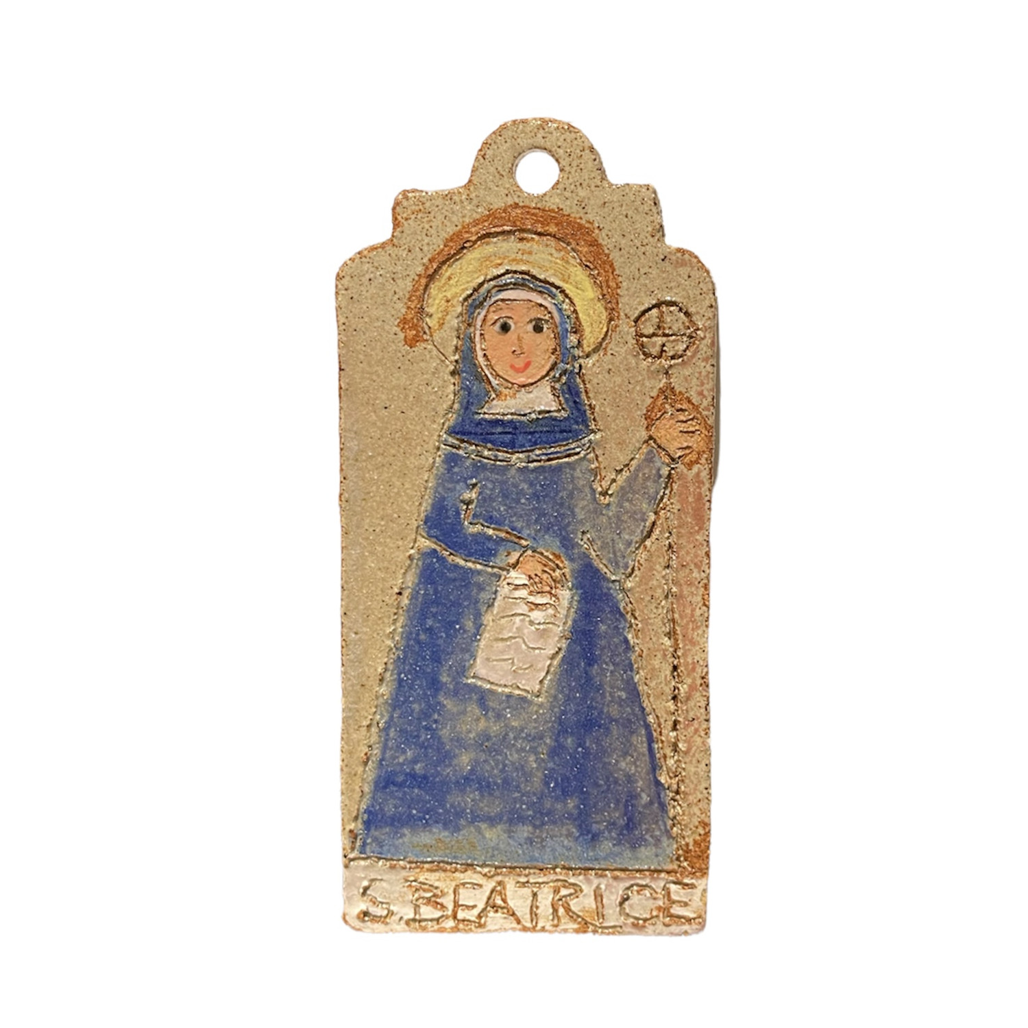 Small panel to hang in handmade stoneware depicting Saint Beatrix. Exclusive design by our ceramist Tania; for over 20 years Tania has been creating for us special handmade objects with her unique style. Each creation is a unique piece, created by Tania exclusively for our workshop and our online shop; thanks to her unmistakable style and sensitivity, these works meet more and more the approval of our loyal customers.
