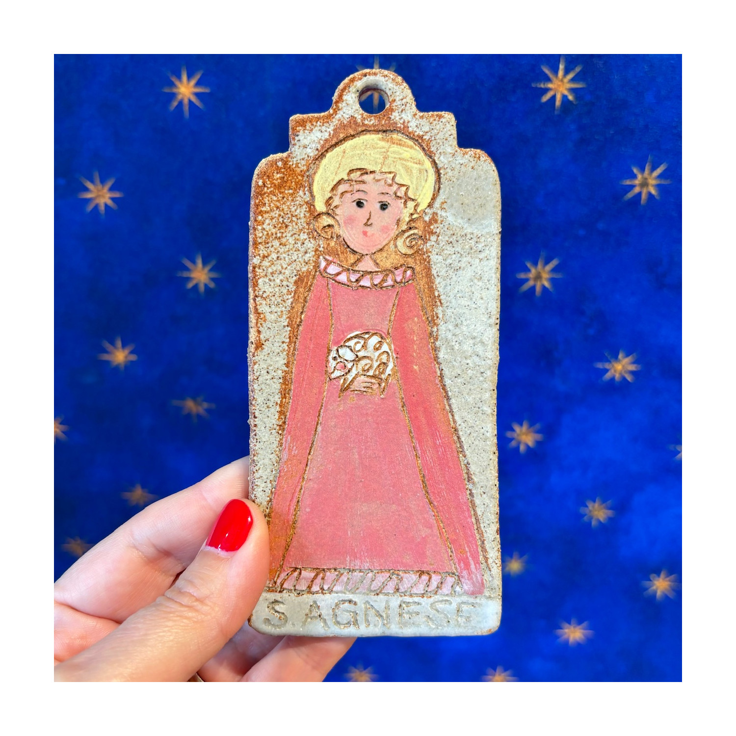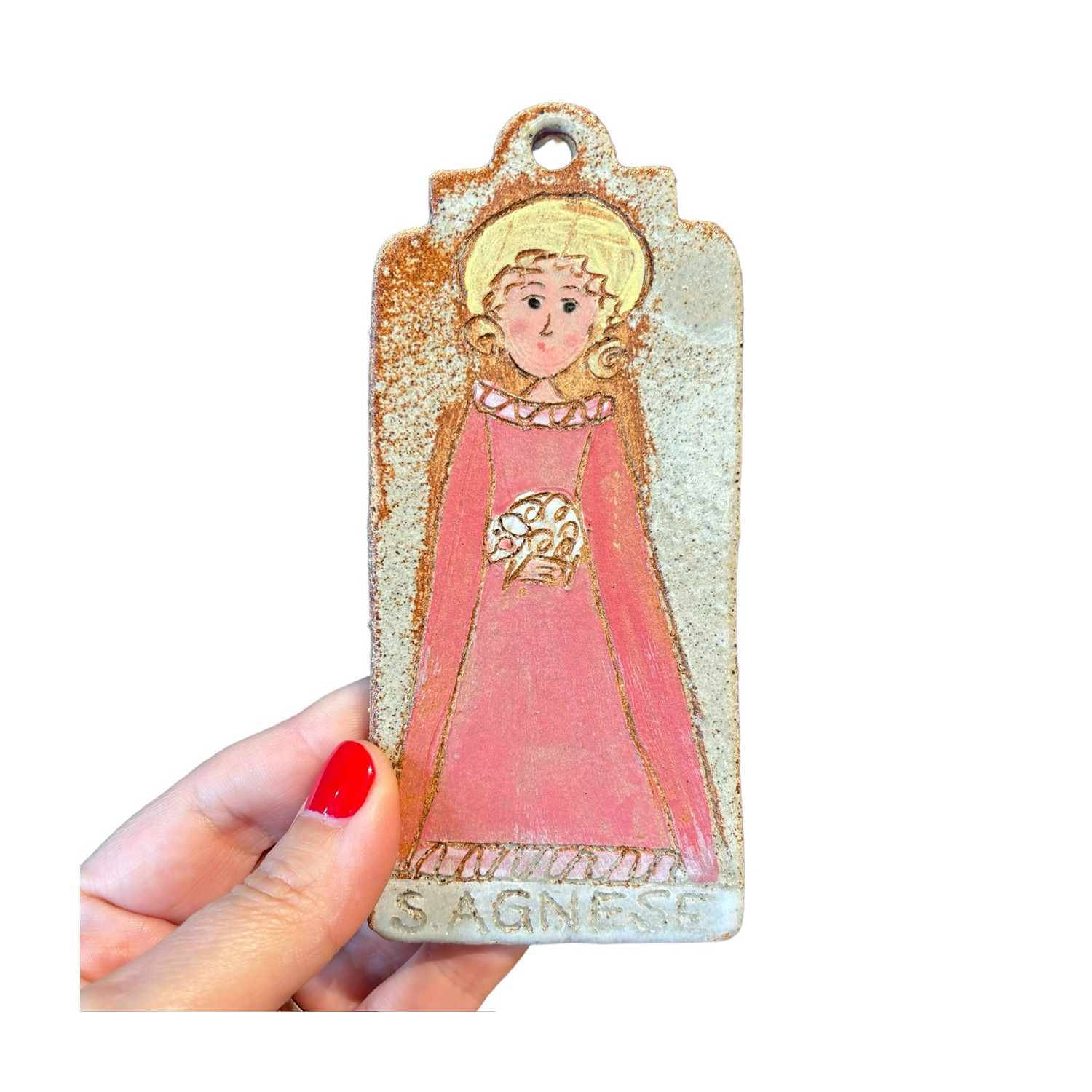 Santa Agnese, small handmade stoneware panel, to hang, measuring 7 x 14 cm.