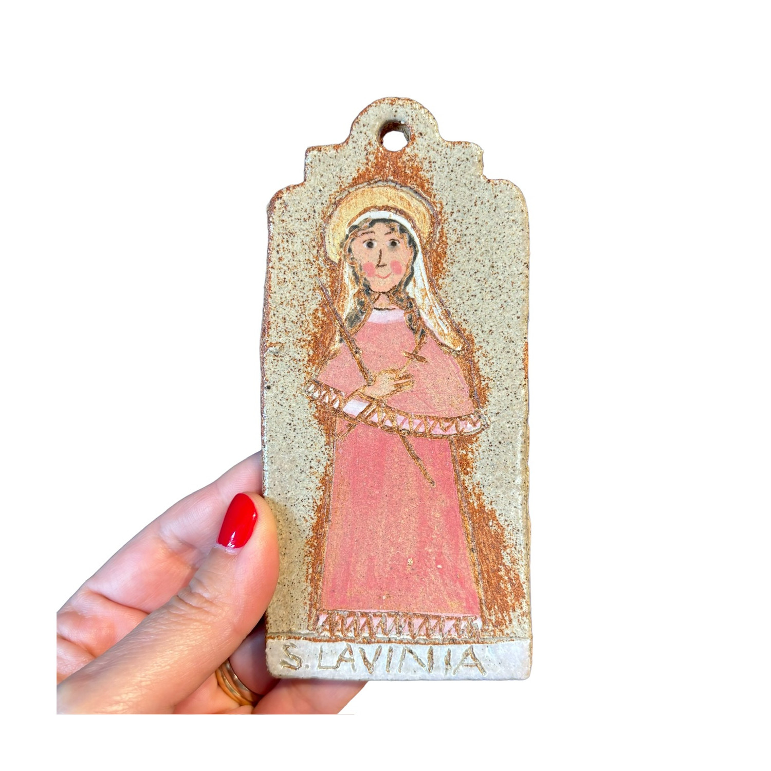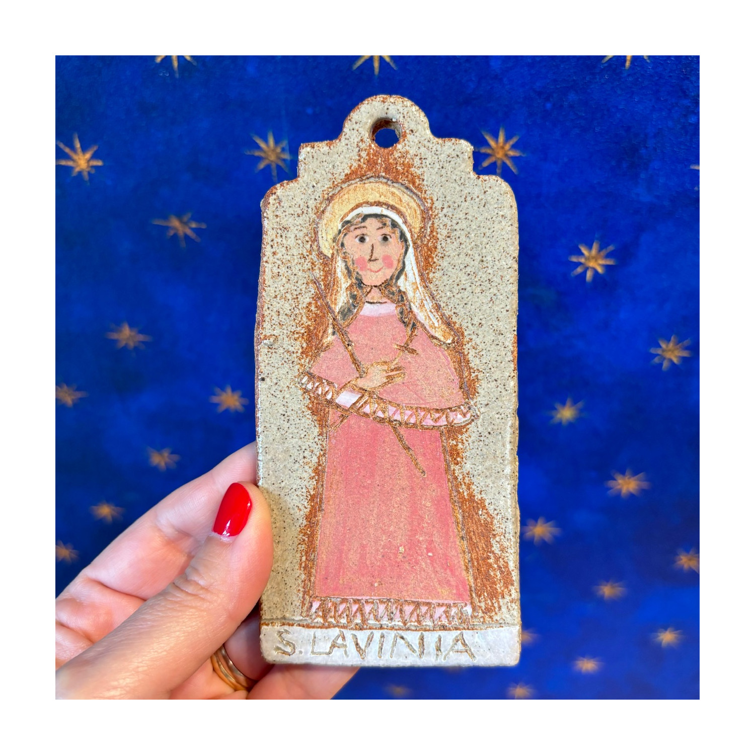 Handmade stoneware holy card, to hang, Saint Lavinia. Measuring 7X14 cm, unique artefact made entirely by hand and decorated with graffiti on natural colors and enamels. Ceramization takes place at 1260°C with high heat firing. The different finishing and chrome plating of the product is a guarantee of a completely manual production process in all its phases.
