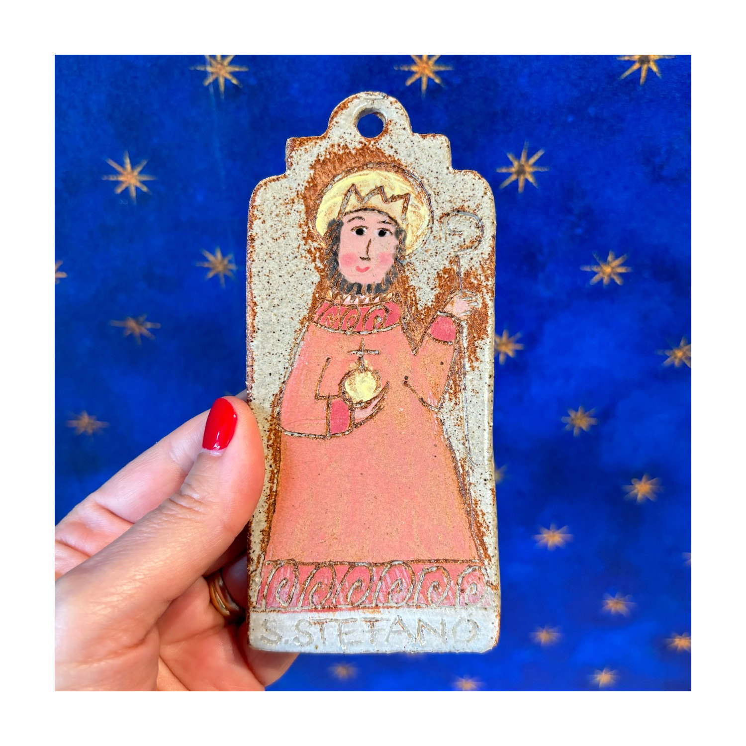 Handmade stoneware holy card, to hang, Saint Stephen. Measuring 7X14 cm, unique artefact made entirely by hand and decorated with graffiti on natural colors and enamels. Ceramization takes place at 1260°C with high heat firing. The different finishing and chrome plating of the product is a guarantee of a completely manual production process in all its phases.