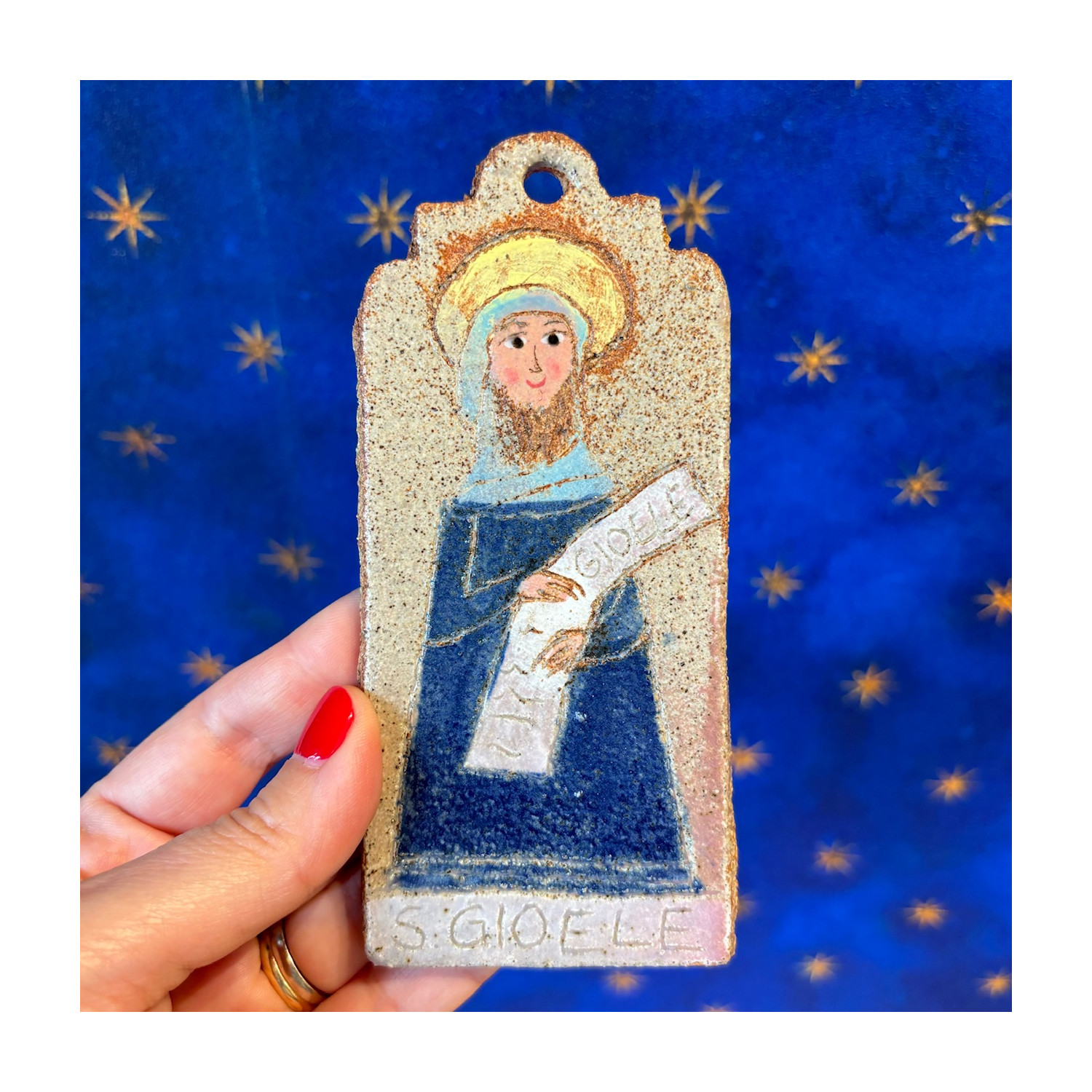 Handmade stoneware holy card, to hang, San Gioele. Measuring 7X14 cm, unique artefact made entirely by hand and decorated with graffiti on natural colors and enamels. Ceramization takes place at 1260°C with high heat firing. The different finishing and chrome plating of the product is a guarantee of a completely manual production process in all its phases.