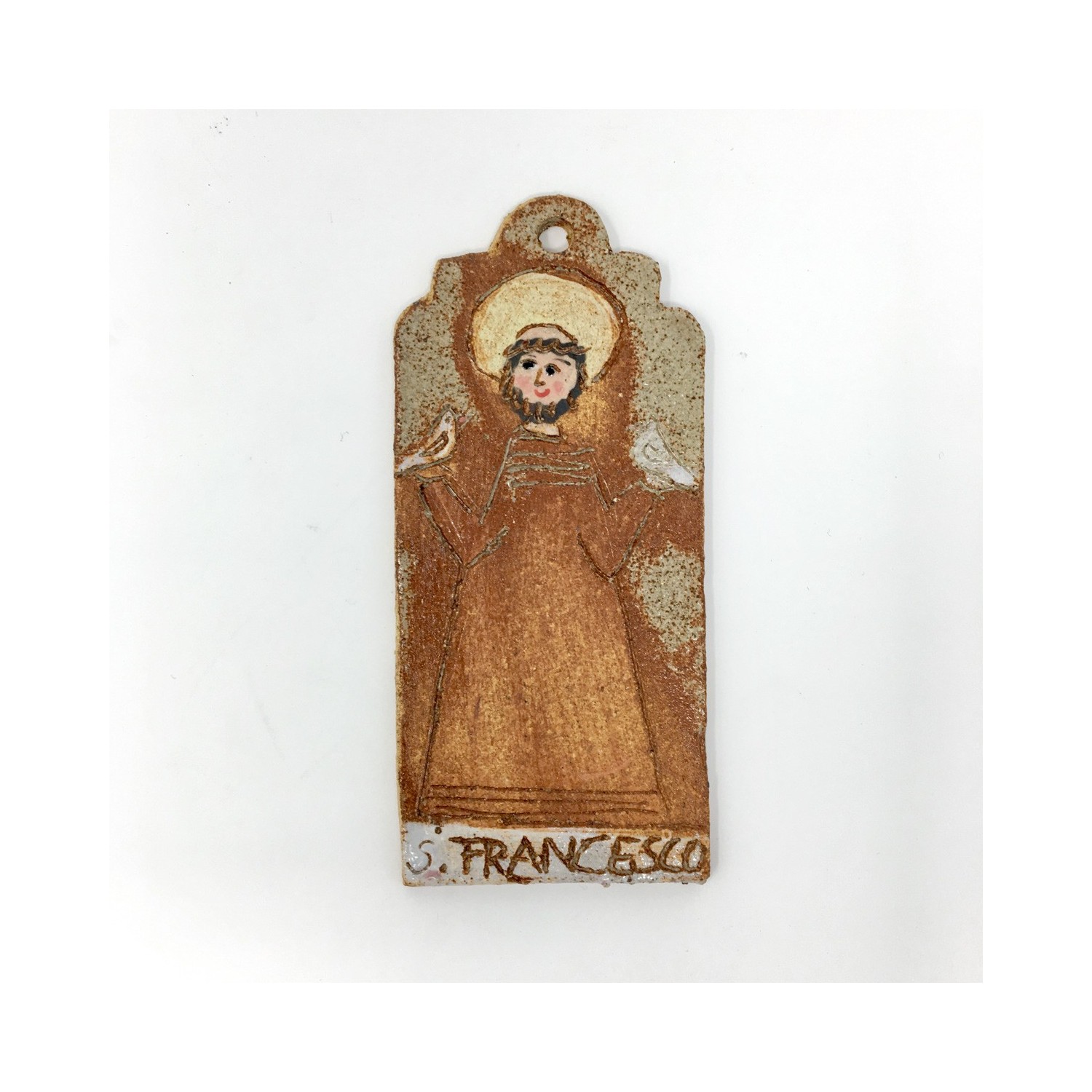 Santino in handmade stoneware, exclusive design of our ceramist Tania. To hang. St. Francis: patron saint of Italy, protector of traders, ecologists, animals, birds, wolves and ladybirds, agesci. Tania, for over 20 years creates for us special objects made by hand with his unique style. Each creation is a unique piece, created by Tania exclusively for our shop and our online shop, thanks to the unmistakable style of Tania and her sensitivity, these works meet more and more the liking of our loyal customers.