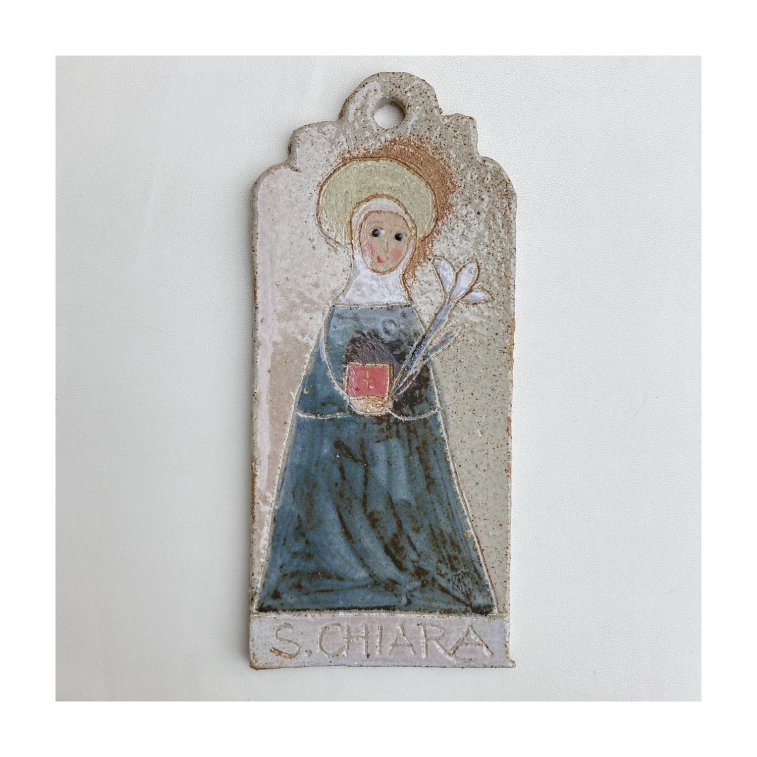 Santino in handmade stoneware, exclusive design by our ceramist Tania. To hang. St. Clare patroness of television.