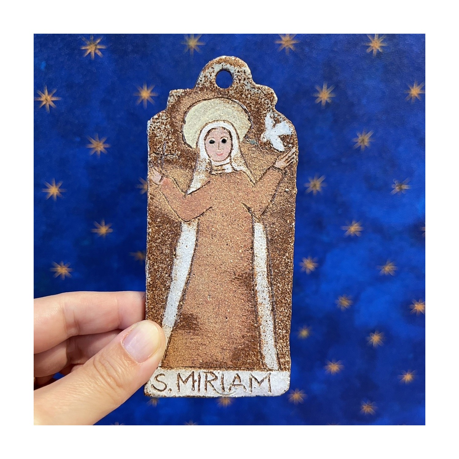 Santa Miriam, small hand made stoneware holy card to hang