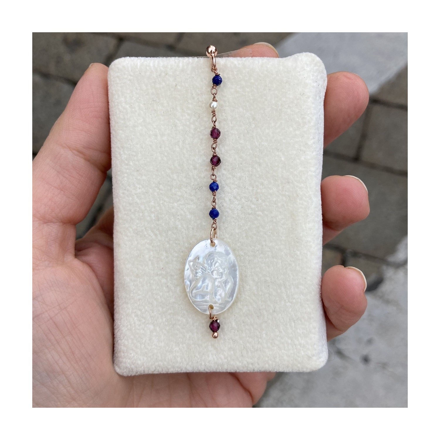 Angel mono earring in natural mother-of-pearl, 925 rosé silver, sapphires, garnet and pearls, with hanging grain.