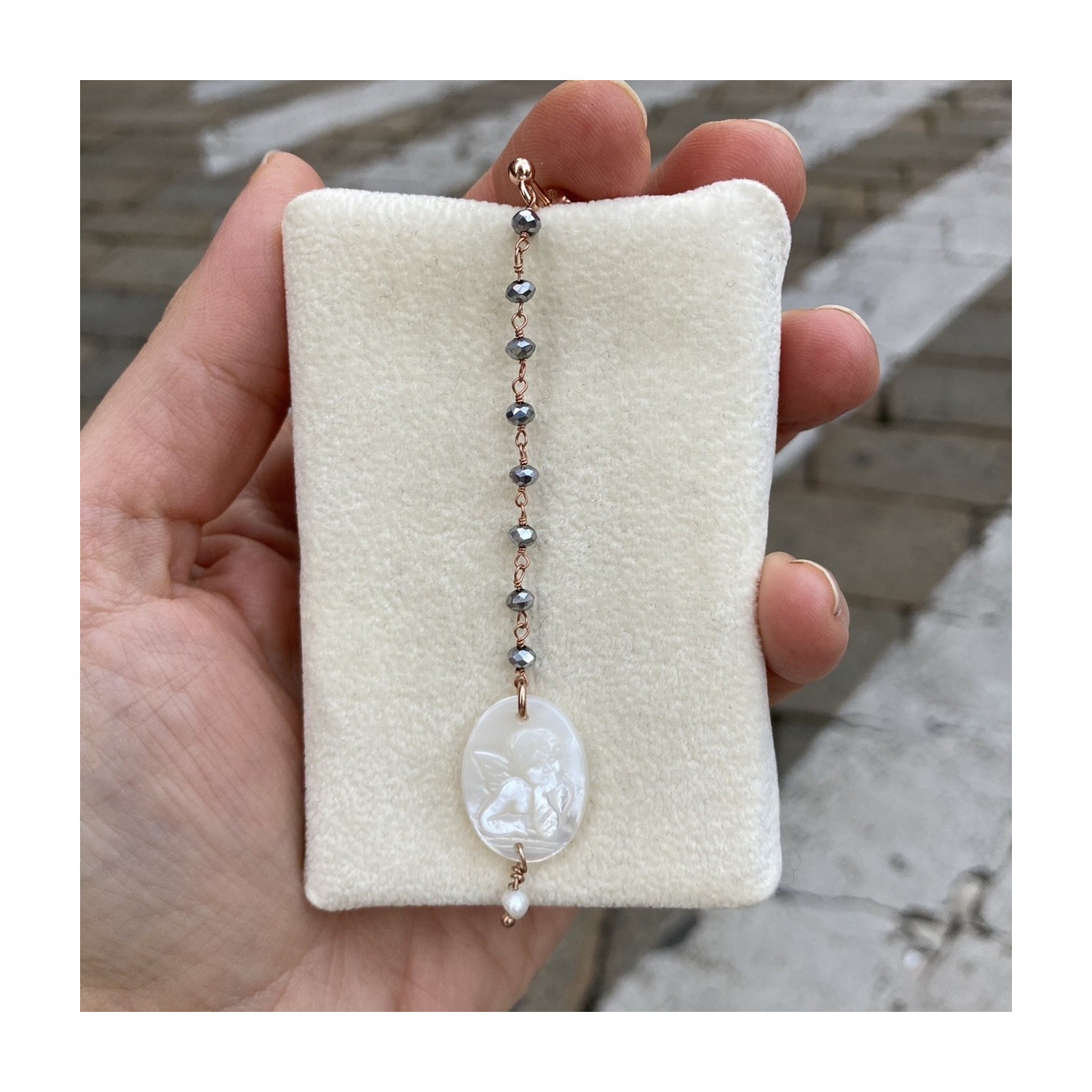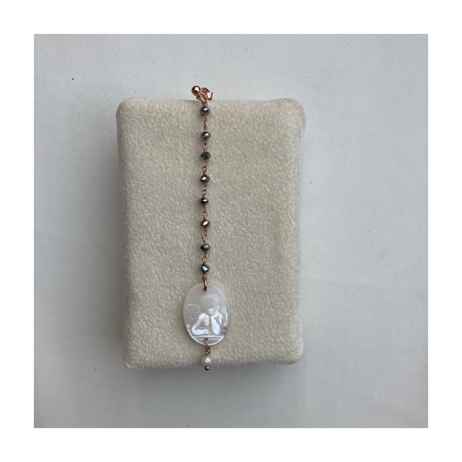 Angel mono earring in natural mother-of-pearl, 925 rosé silver and hematite crystal, with hanging grain.