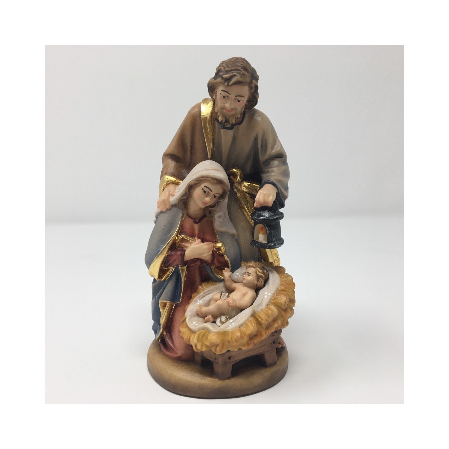 Nativity group in maple wood carved and hand painted in Val Gardena, baby Jesus detachable. This one-piece nativity scene is carved from maple wood and painted with oil colors by the sculptor craftsmen from south tyrol. The little baby Jesus is lying on the cradle, it can be detached and then placed on Christmas Eve; it is the alternative for those who do not have the possibility to set up a real nativity scene, the mystery of Christmas is represented in a single piece.
