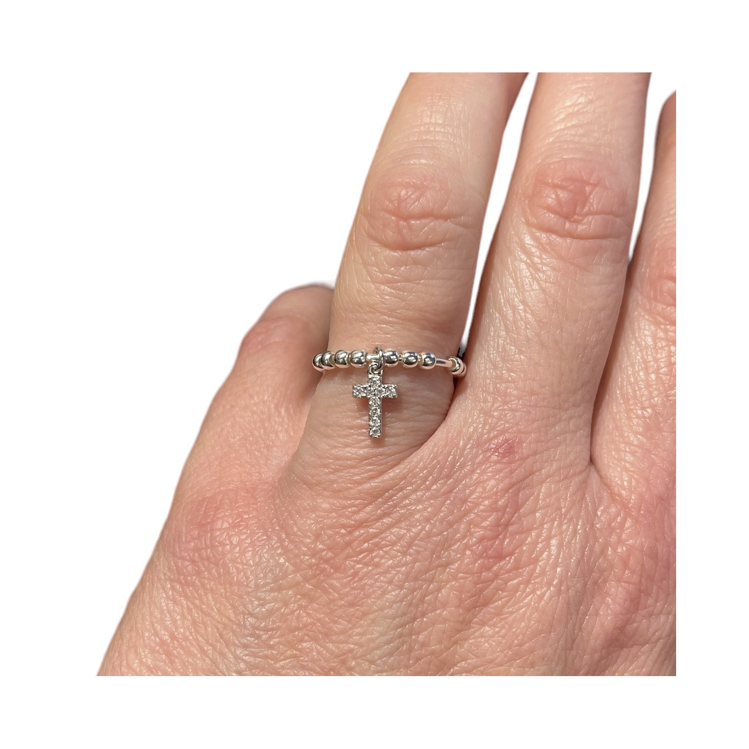 Anello rosario con grani scorrevoli in argento 925. Piccola croce pendente con zirconi incassati.